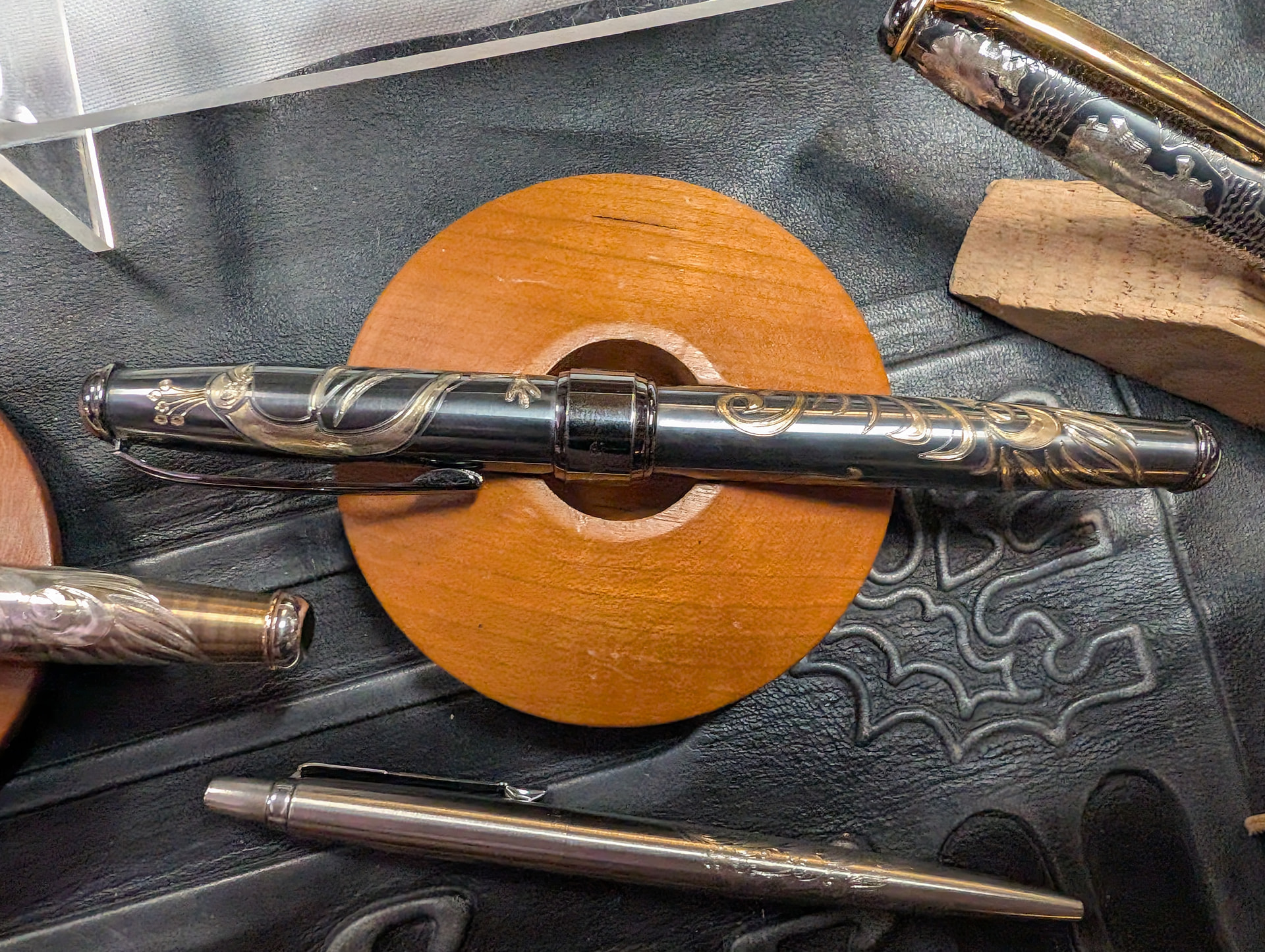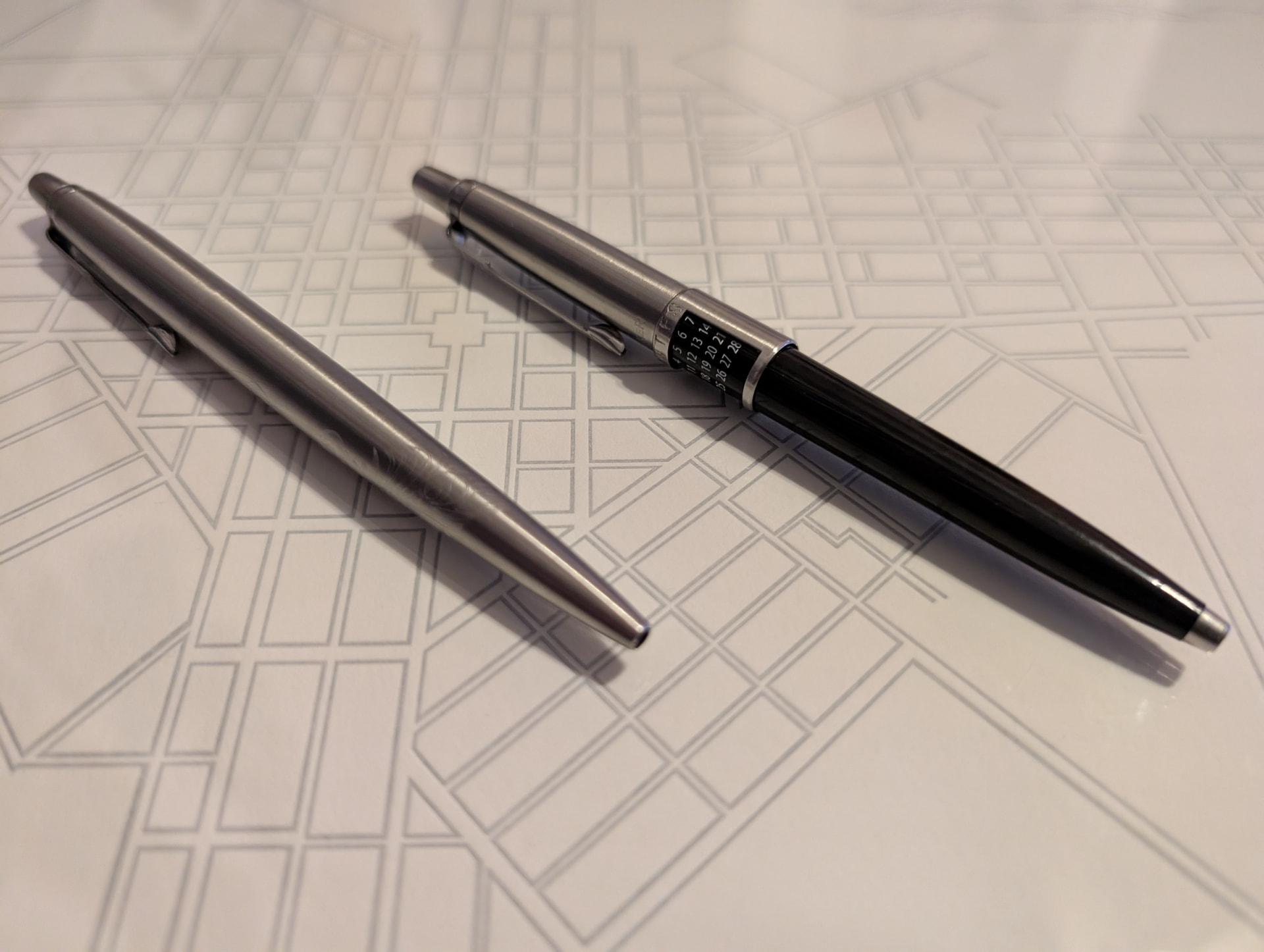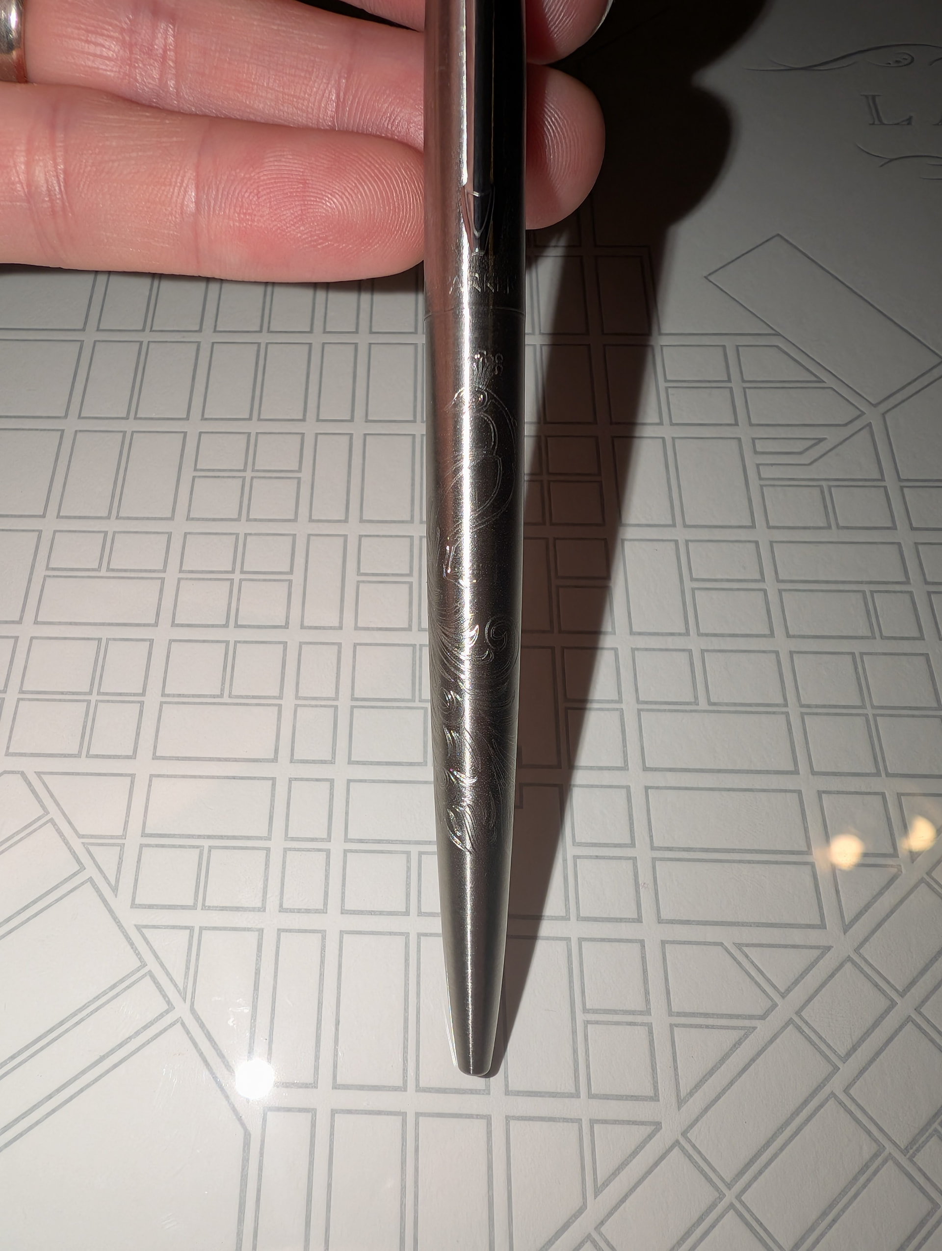 I do love a Parker Jotter. They are simple, but elegant. Nice quality and affordable. And that CLICK! I picked up these from two different stands. The metal and black plastic one came from a guy who had a bunch of older pens and a good amount of Jotters. It does have a perpetual calendar and I had never seen this before and thought it was neat. I am relatively new to seriously collecting pens (2-ish years but appreciated them before that). The full metal Jotter came from a stand for a company called Grifos Pens of Italy. So @Leonov, I image that you could likely see them at some shows near you. Jotters are not their thing though. They make luxury pens with some beautiful metal work. The gentleman there explained that he uses Jotters and other metal pens of similar value to practice milling on as well as warming up the milling bit on. The picture below my new Jotters is one of Grifos’ pens that had a beautiful peacock design on it which is the same design milled in the full metal Jotter. It is hard to see in the picture but I liked it. The pens that Grifos’ make themselves run $450.00+ (US) and were not in my budget. I wish!