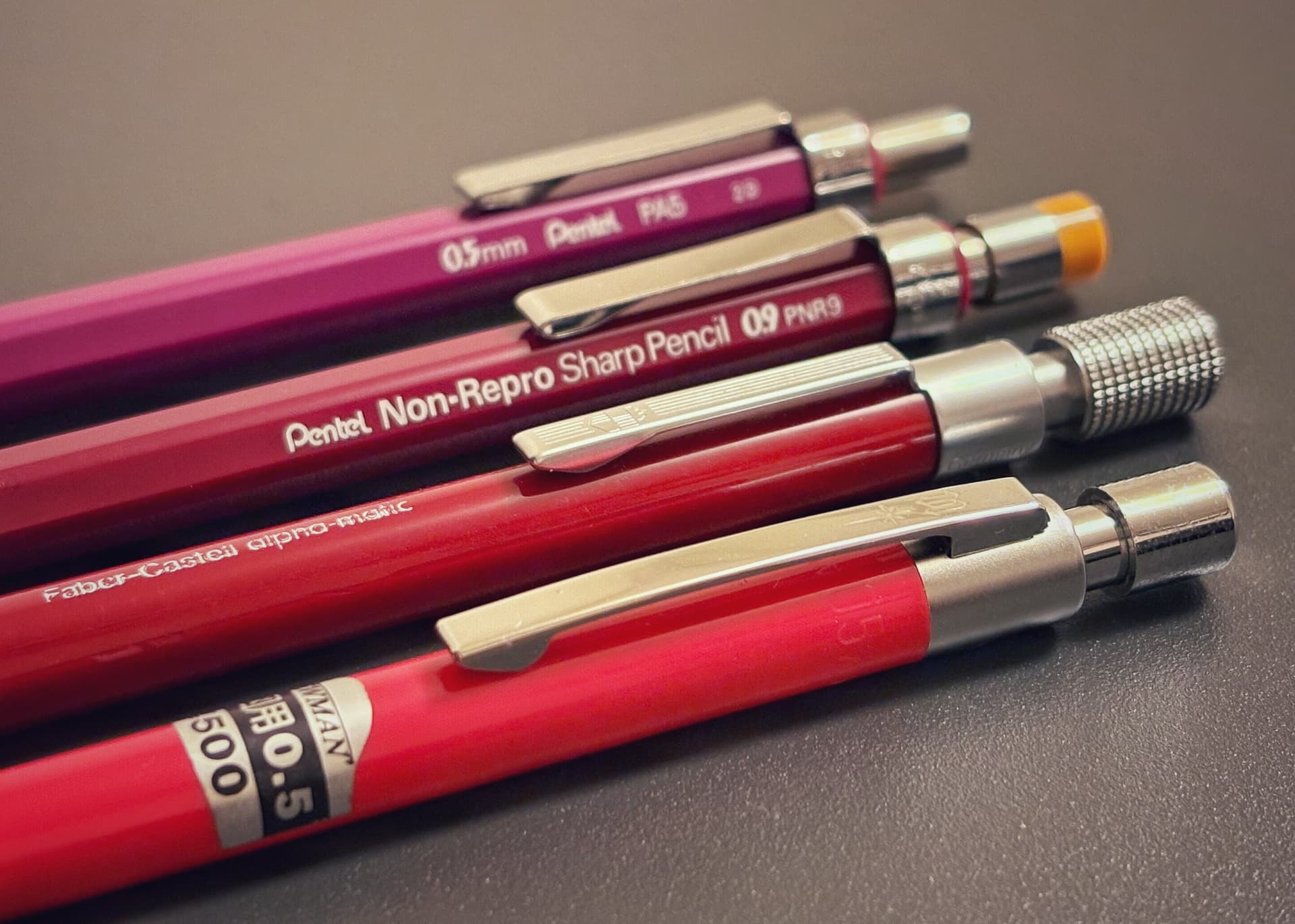 By the way: if one extends the “linear” part of the knurling section common to all items in the picture all the way up to the pushbutton of the barrel, then one gets one of the Mitsubishi Automatic pencils — the one with the lead hardness indicator in a knurled crown just under the knock button, I don’t know yet the exact model number.