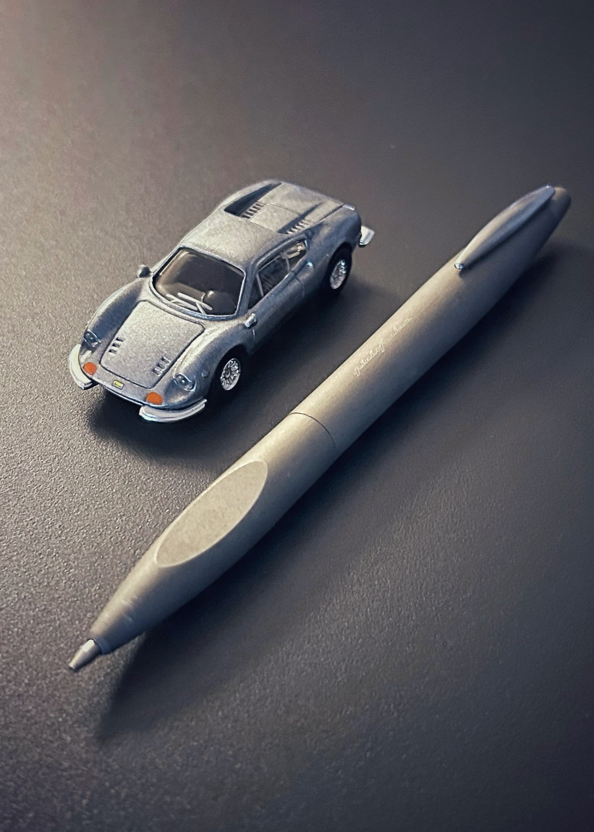 To match up with the Dino is an also-obscure Parafernalia mechanical pencil, ostensibly designed by (someone at) Pininfarina. My best guess is this was a product of the 1990s or early 2000s. The all-aluminum body features a scallop cutout at the grip, just like the OBJECT CR 100. It’s a twist mechanism impinging on a Schmidt (what else?) unit inside.