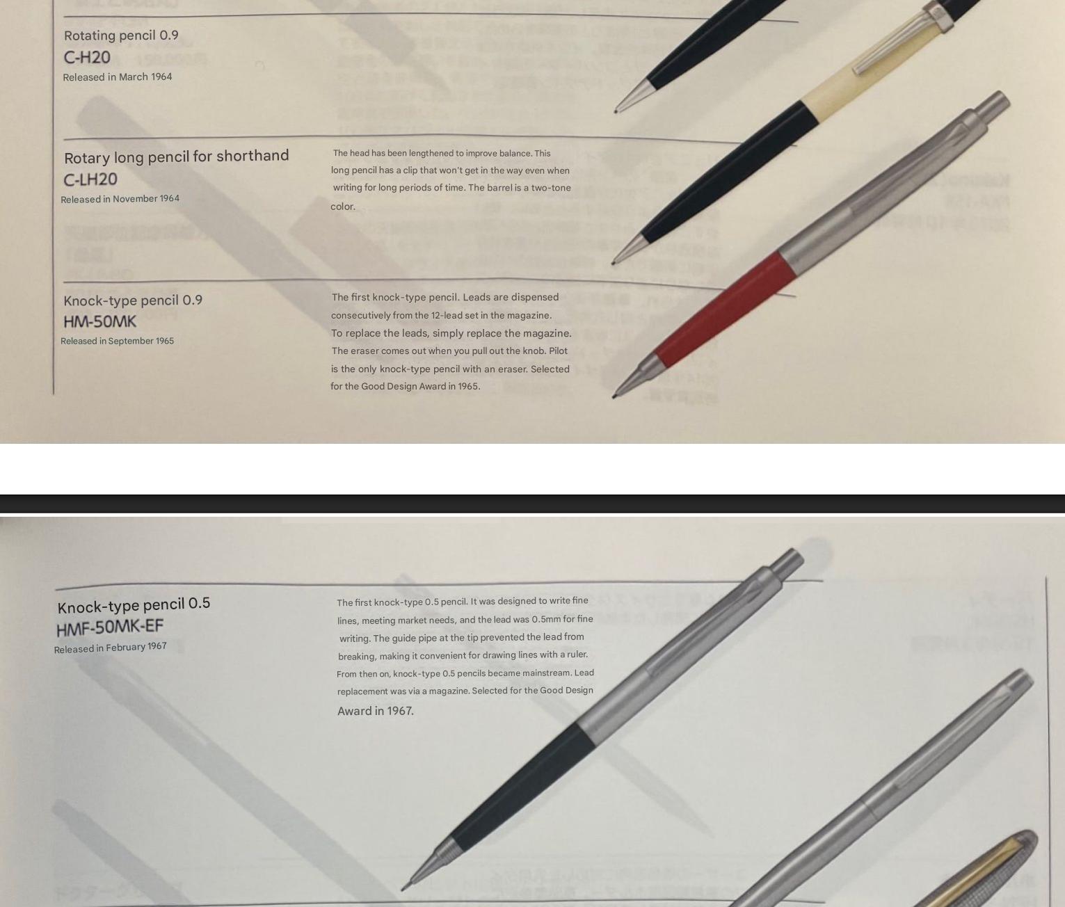 From what I can see in catalogues, Pilot offered a much wider range of such pencils, in more colors and price points, than Pentel, which leads me to believe they were either the first, or at least the most active, in this market segment. But going so far as to hint they might have invented the eraser under the cap in 1965. Hmm… not sure about that.