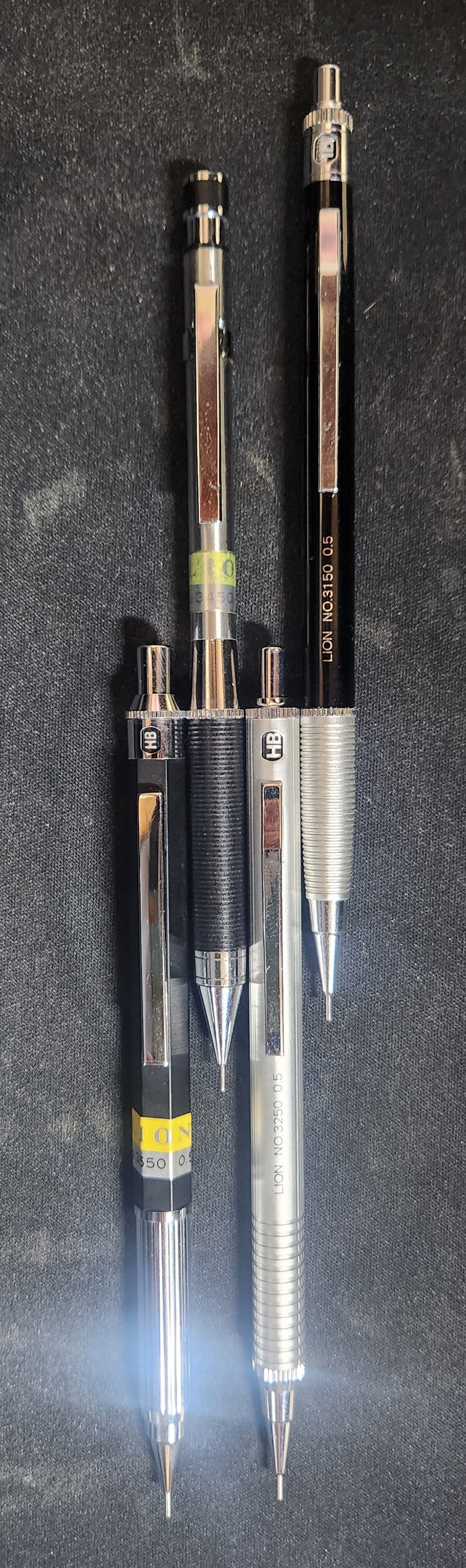 Rather than wait for some impossible miracle, I decided to take some pictures of just the 0.7mm models… like a truncated showcase of the LION drafting family. From L-R: