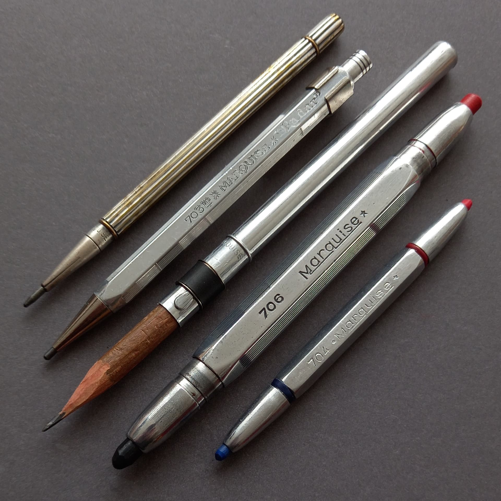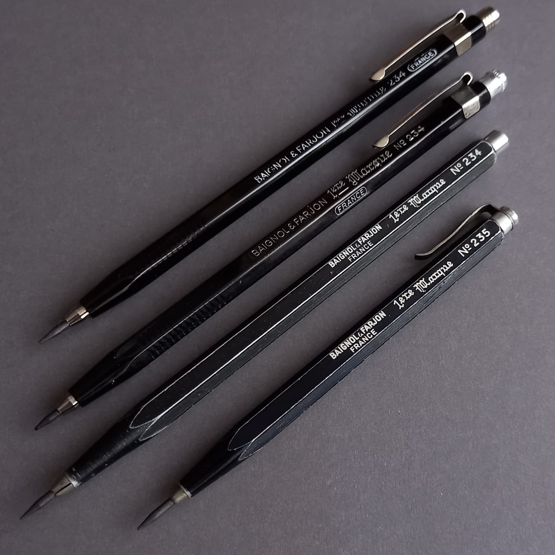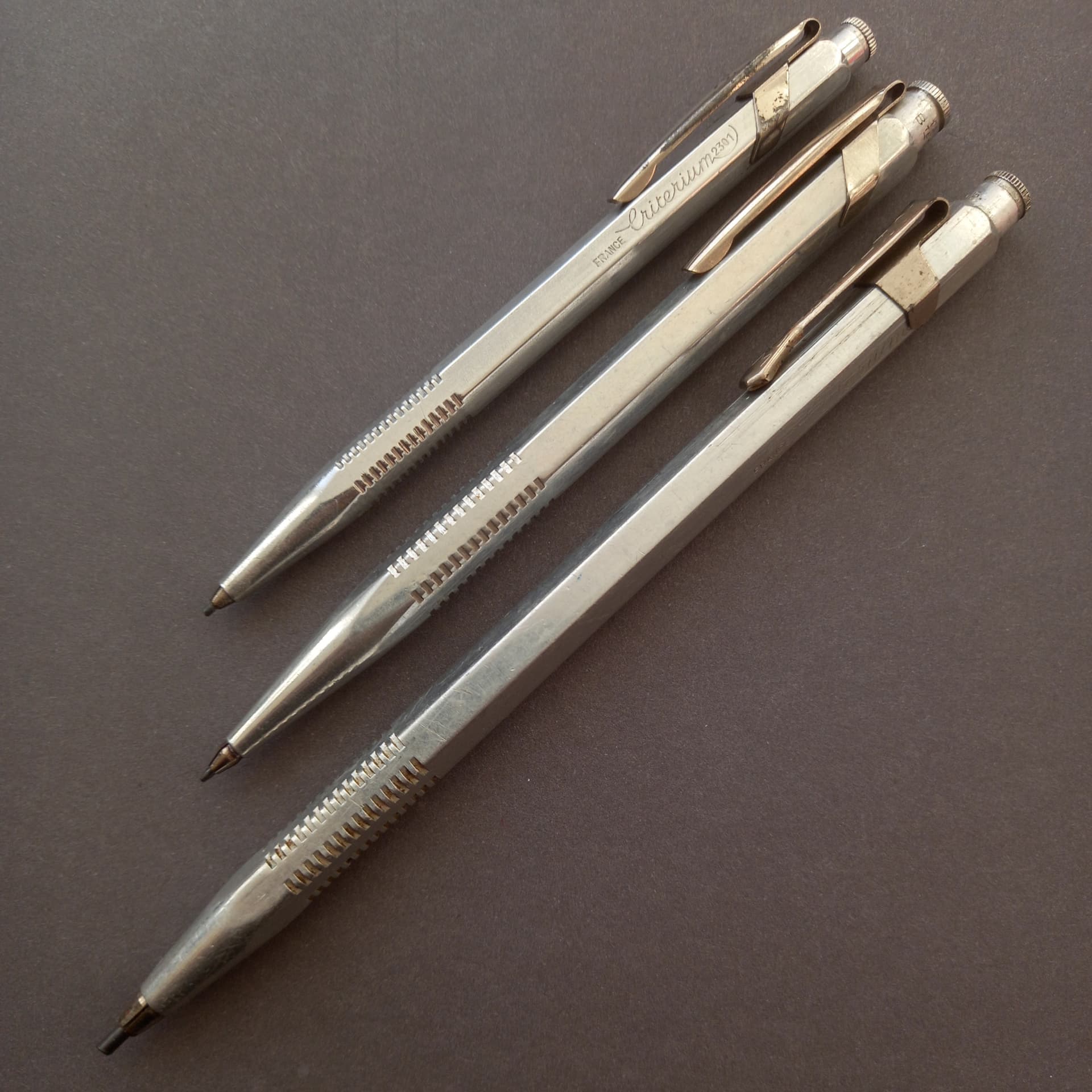 I have only ever seen this one example. It doesn’t apear in the excellent ‘Le criterium au fil du temps’ list… yet, though I note one commenter refers to it existing on that site. Again it’s a 3 jaw pushbutton clutch holding 1.18mm lead. In the other image I’ve thrown in the longer 2603 and midi sized 2403 for comparison.