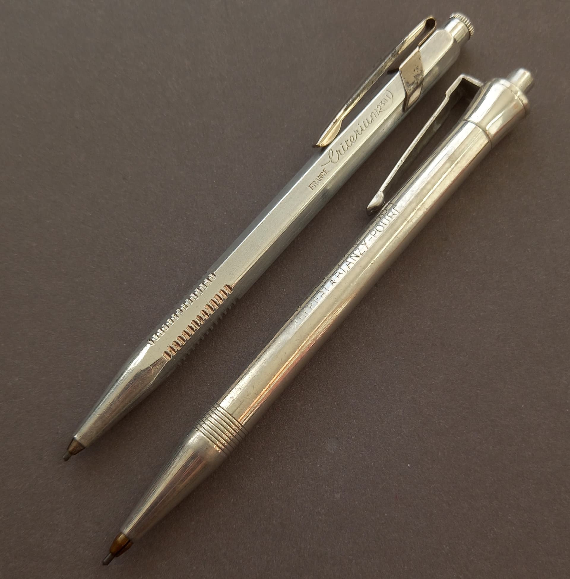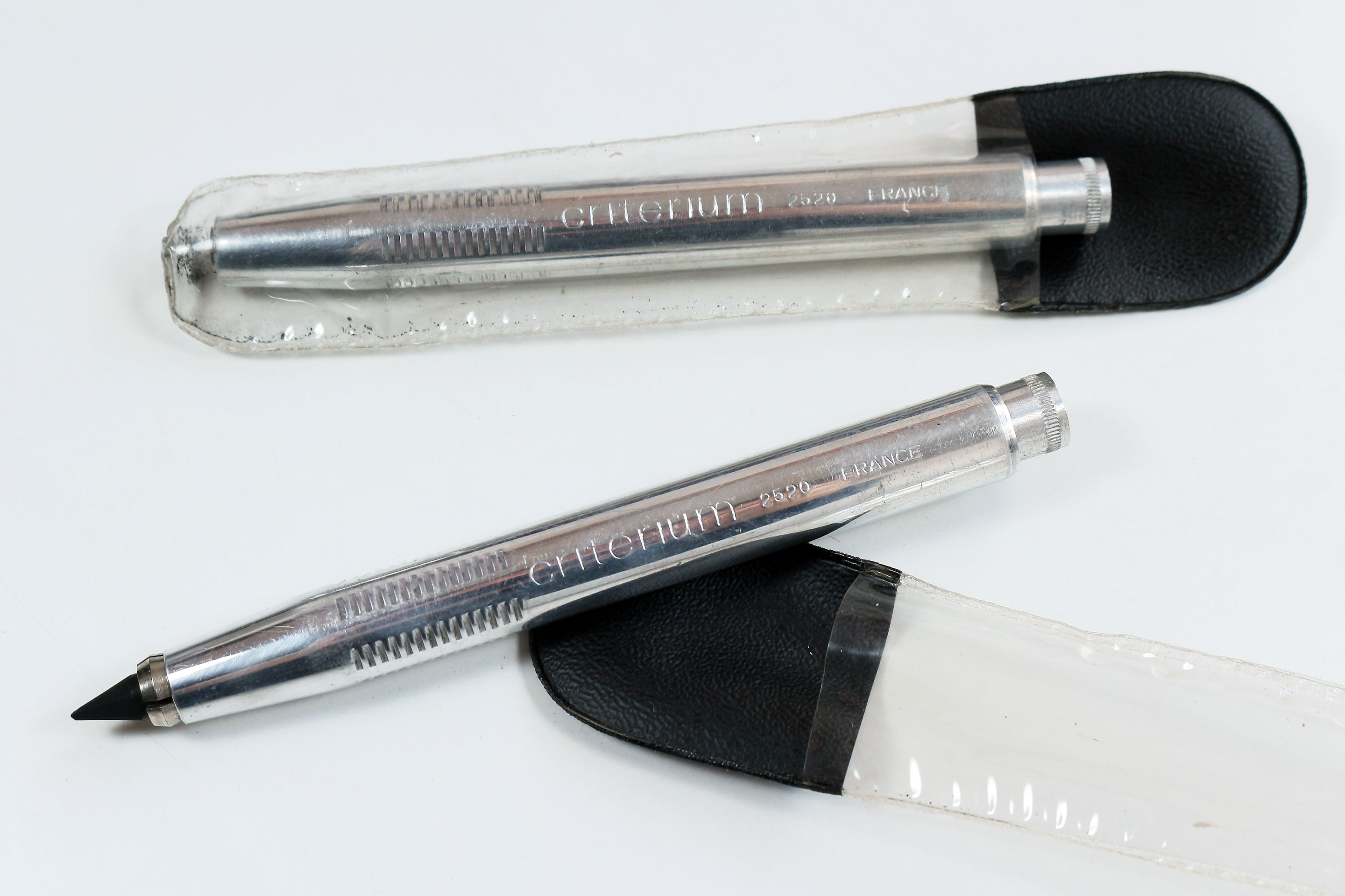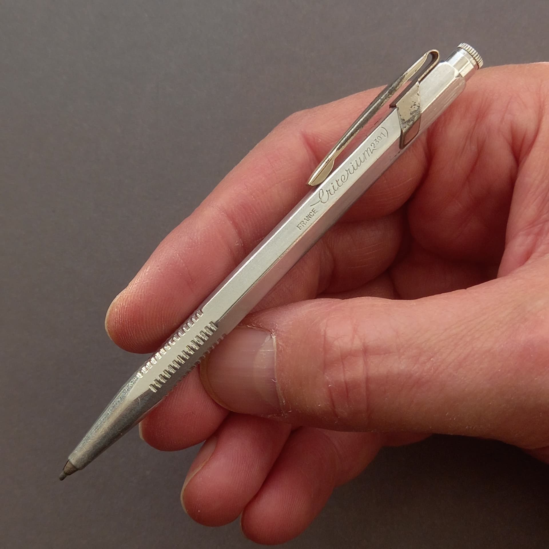 As far as I can see, the Criterium was launched in 1939 by Gilbert & Blanzy Pour of Boulogne-sur-Mer in the North West of France, after the Gilbert pencil company merged with ‘Blanzy Poure & Compagnie’. This initial design, with it’s push-button 3 jaw visible clutch holding a 1.18mm lead, survived the second world war which began that year, still appearing in print advertisements until at least 1950, 11 years after its launch. This is one of only two examples I’ve seen turn up in 10 years searching and this one is the only one I have found with its chunky angular clip still present, stamped with the round GBP logo. The clip is formed stamped aluminium alloy pressure cynched onto the body, meaning the clip often wore loose and came away from the barrel. All the metal Criterium models are made from a 4% copper, 96% aluminium alloy called ‘Dural’ to prevent oxidisation and corrosion, so it’s still in fairly decent condition, even after it’s 70 or 80 years of use. The other newer iteration is the more recogniseable Criterium form, though a tiny version of it.