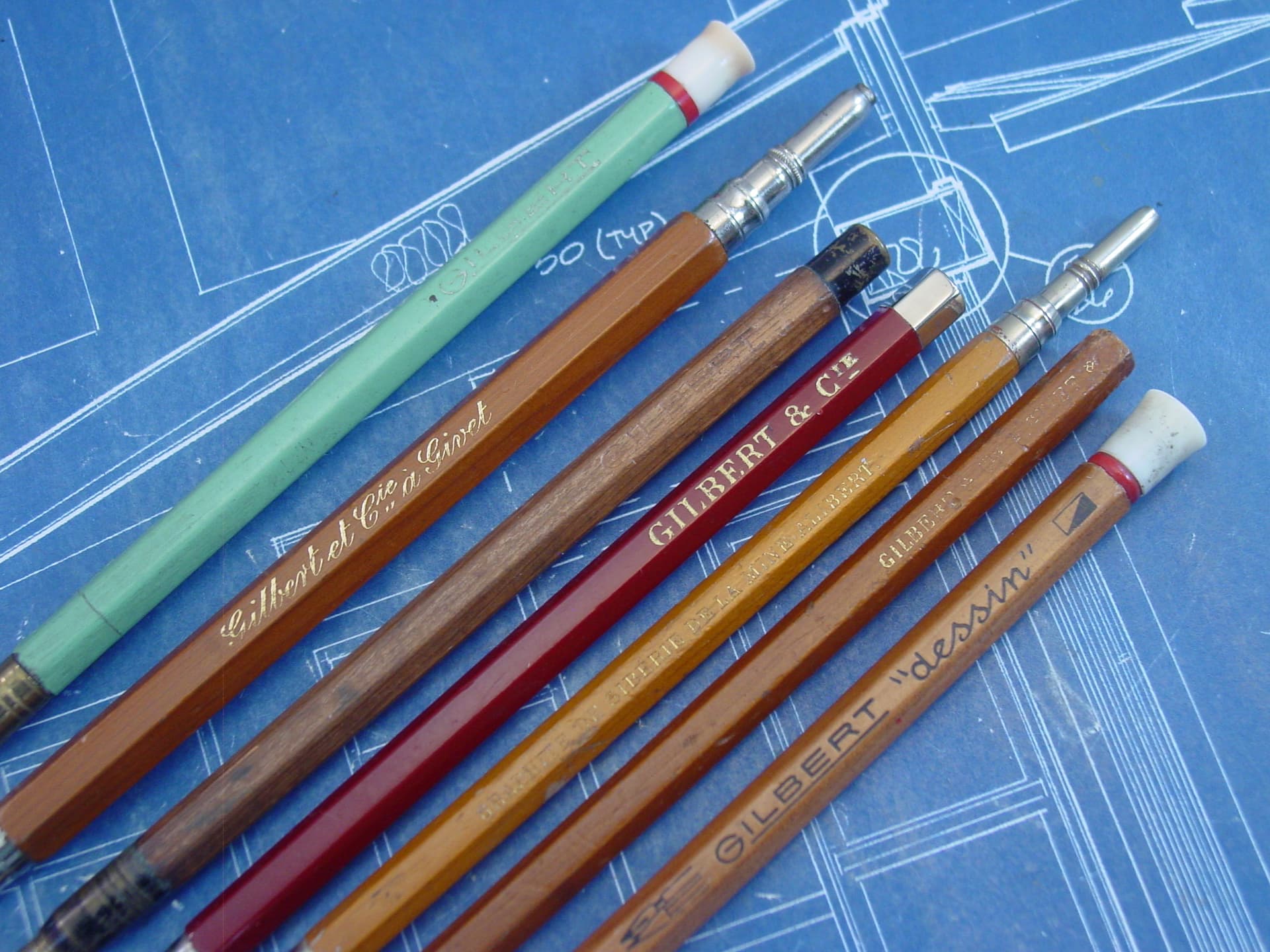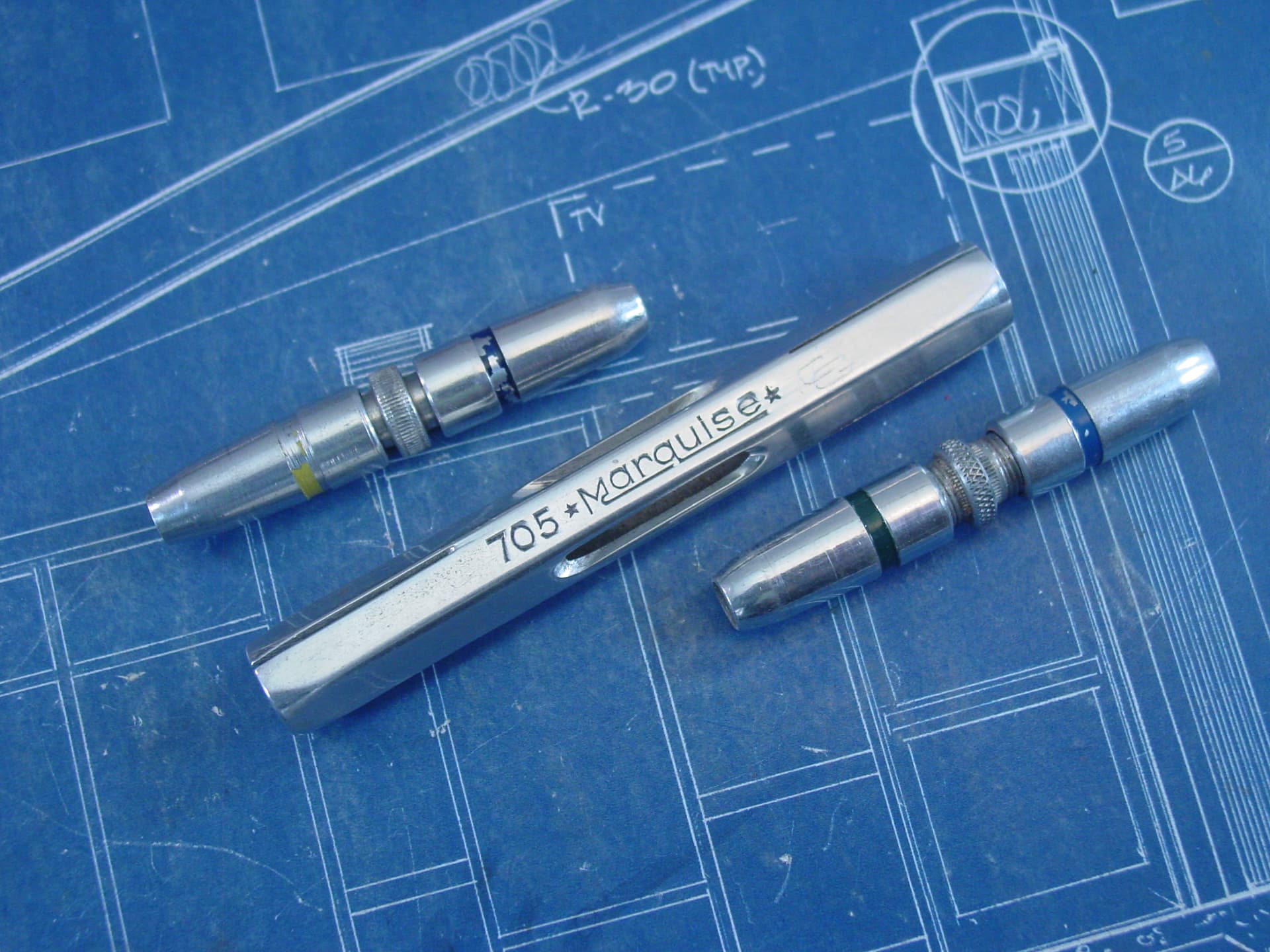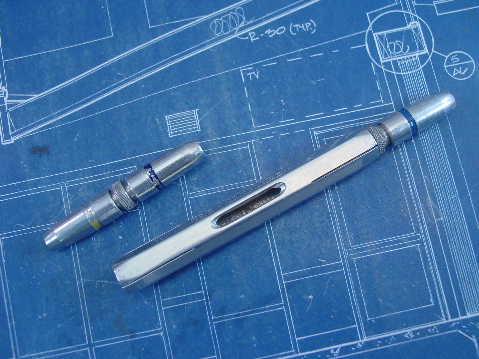 As far as I can see, the Criterium was launched in 1939 by Gilbert & Blanzy Pour of Boulogne-sur-Mer in the North West of France, after the Gilbert pencil company merged with ‘Blanzy Poure & Compagnie’. This initial design, with it’s push-button 3 jaw visible clutch holding a 1.18mm lead, survived the second world war which began that year, still appearing in print advertisements until at least 1950, 11 years after its launch. This is one of only two examples I’ve seen turn up in 10 years searching and this one is the only one I have found with its chunky angular clip still present, stamped with the round GBP logo. The clip is formed stamped aluminium alloy pressure cynched onto the body, meaning the clip often wore loose and came away from the barrel. All the metal Criterium models are made from a 4% copper, 96% aluminium alloy called ‘Dural’ to prevent oxidisation and corrosion, so it’s still in fairly decent condition, even after it’s 70 or 80 years of use. The other newer iteration is the more recogniseable Criterium form, though a tiny version of it.