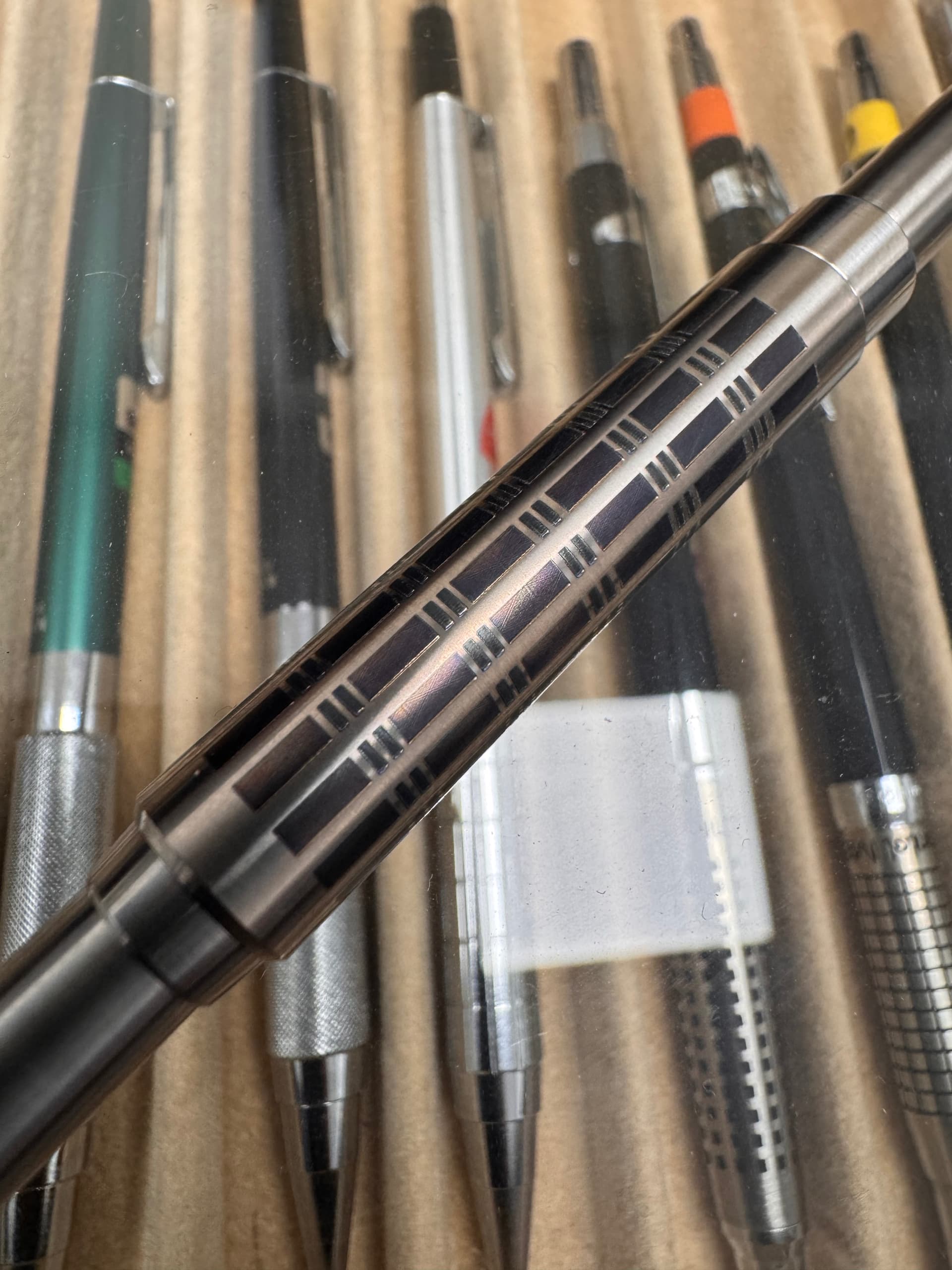 It’s got sort of a gradient type of etch to it with less being closer to the grip, and the small rectangles seem to be a sort of annealed titanium.