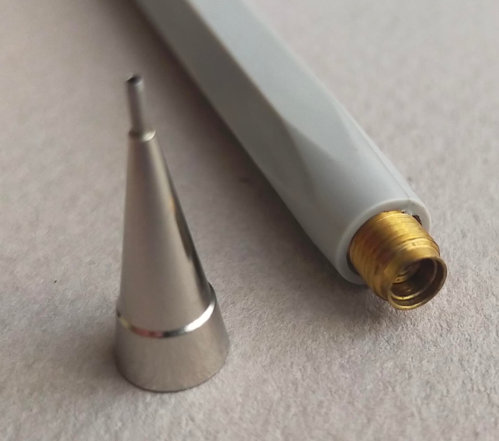 Found a green octogonal one. No text on it at all, but the internals are identical, the cone is the same with the lead sleeve slightly longer. The body is also longer by about 2 mm than the hexagonal grey. Button is cilyndrical and grooved instead of flared.