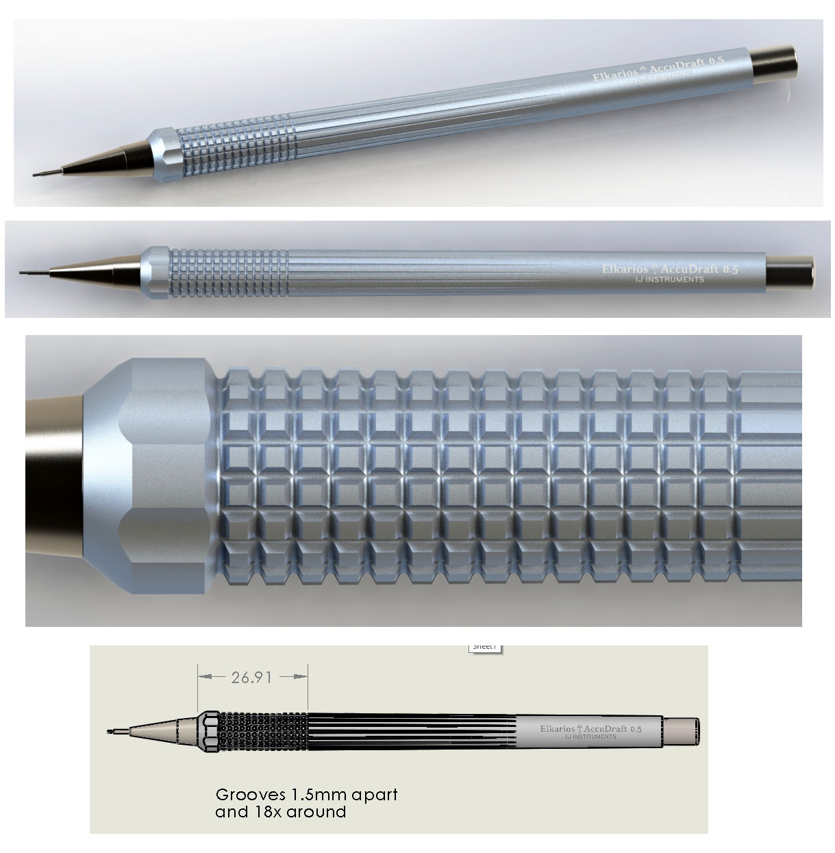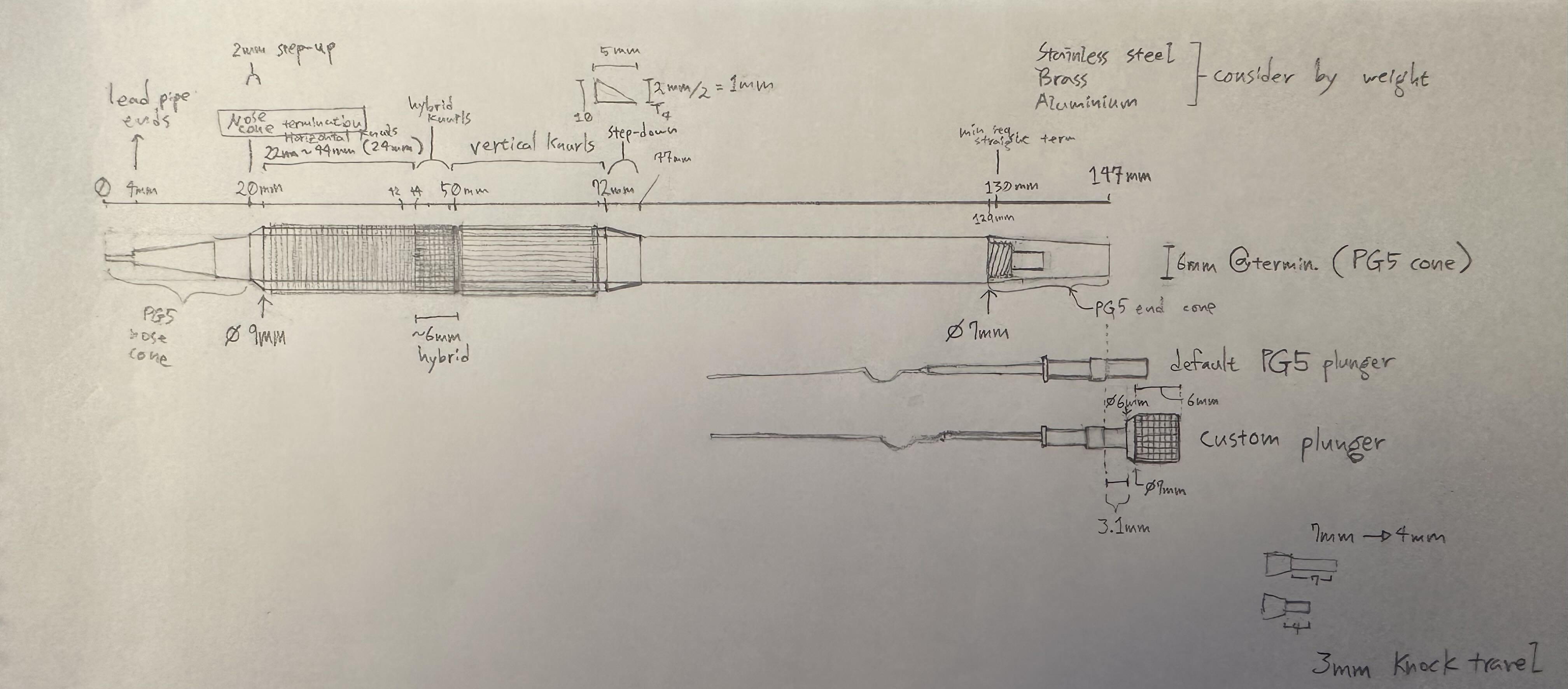 I first came up with this design during Summer of 2025, after I began brainstorming what the ideal pencil body shape would be for my style of grip. After some ergonomics studies, as well as trying out an extensive number of extant models of mechanical pencils, I finalized the first draft on paper in June: