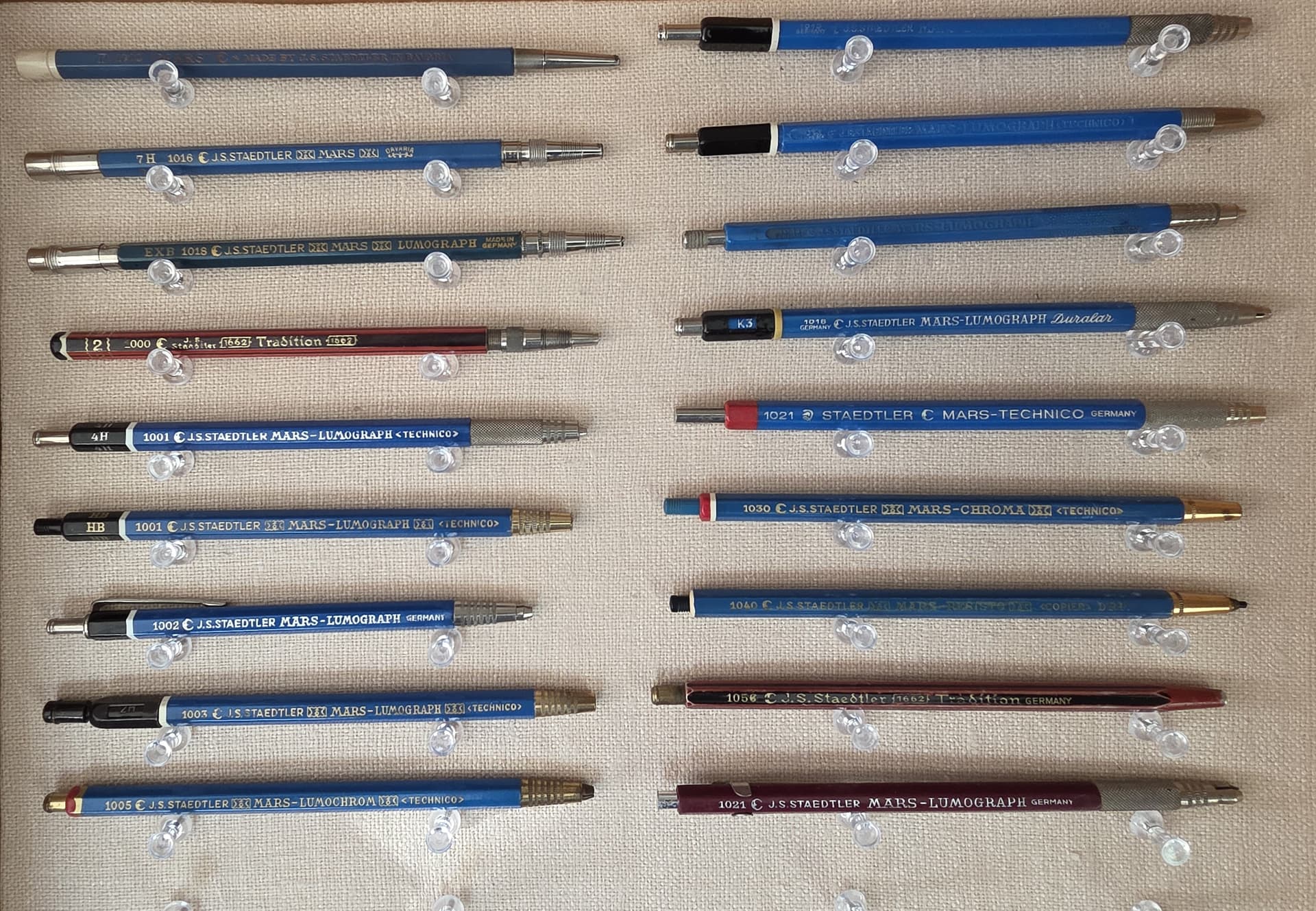 Dennis B. Smith’s archive dates many of these pieces between the “antique-shop” material sitting between 1890’s and 1910’s and the stuff available up until circa 1950’s, which I admit is quite a long stretch of time; after ruling out the tails of the distribution, I would say most of these Staedtlers ought to fall between 1930’s and 1940’s, slowly disappearing after the spreading of the plastic resins, but without catalogues or other similar sources, mine remains a wild guess.