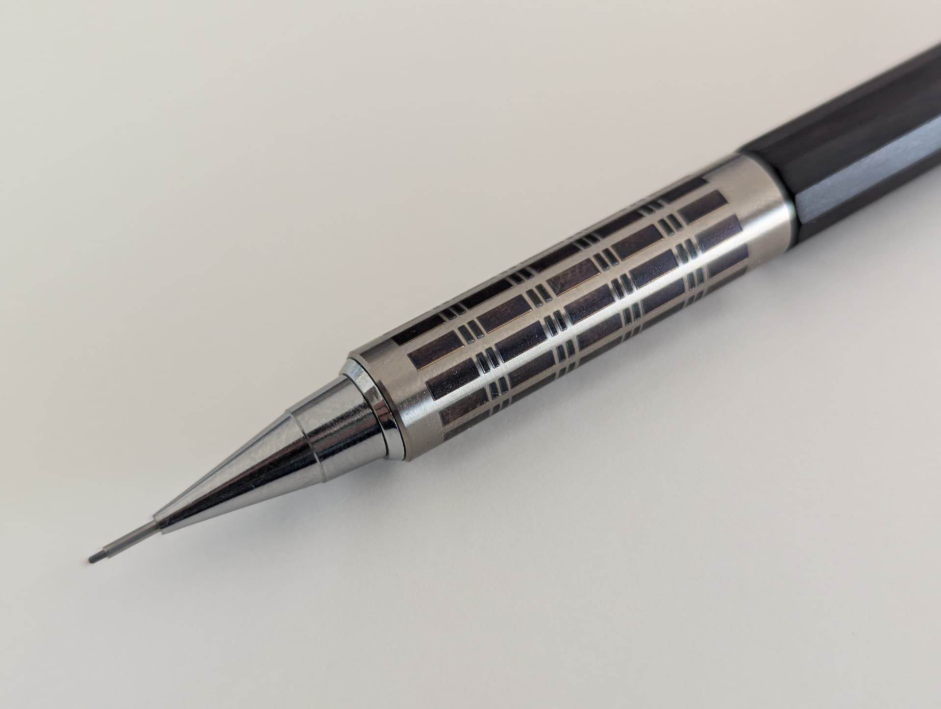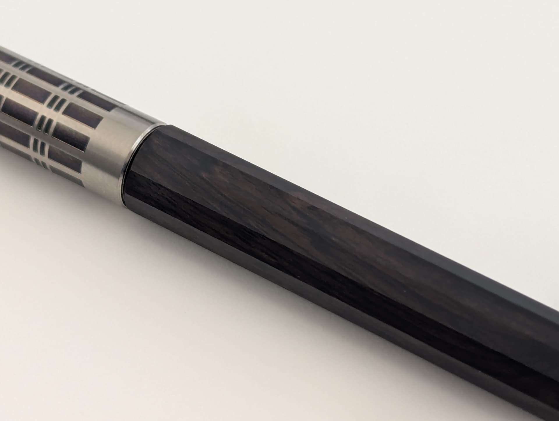 The Sharp Tank pencil cuts no costs in the materials. Titanium for the etched grip, metal inner tube for the lead tube, plus african blackwood for the body. I had been searching for a pencil from him for a long time with these exact specs and I’m so glad I could get one.