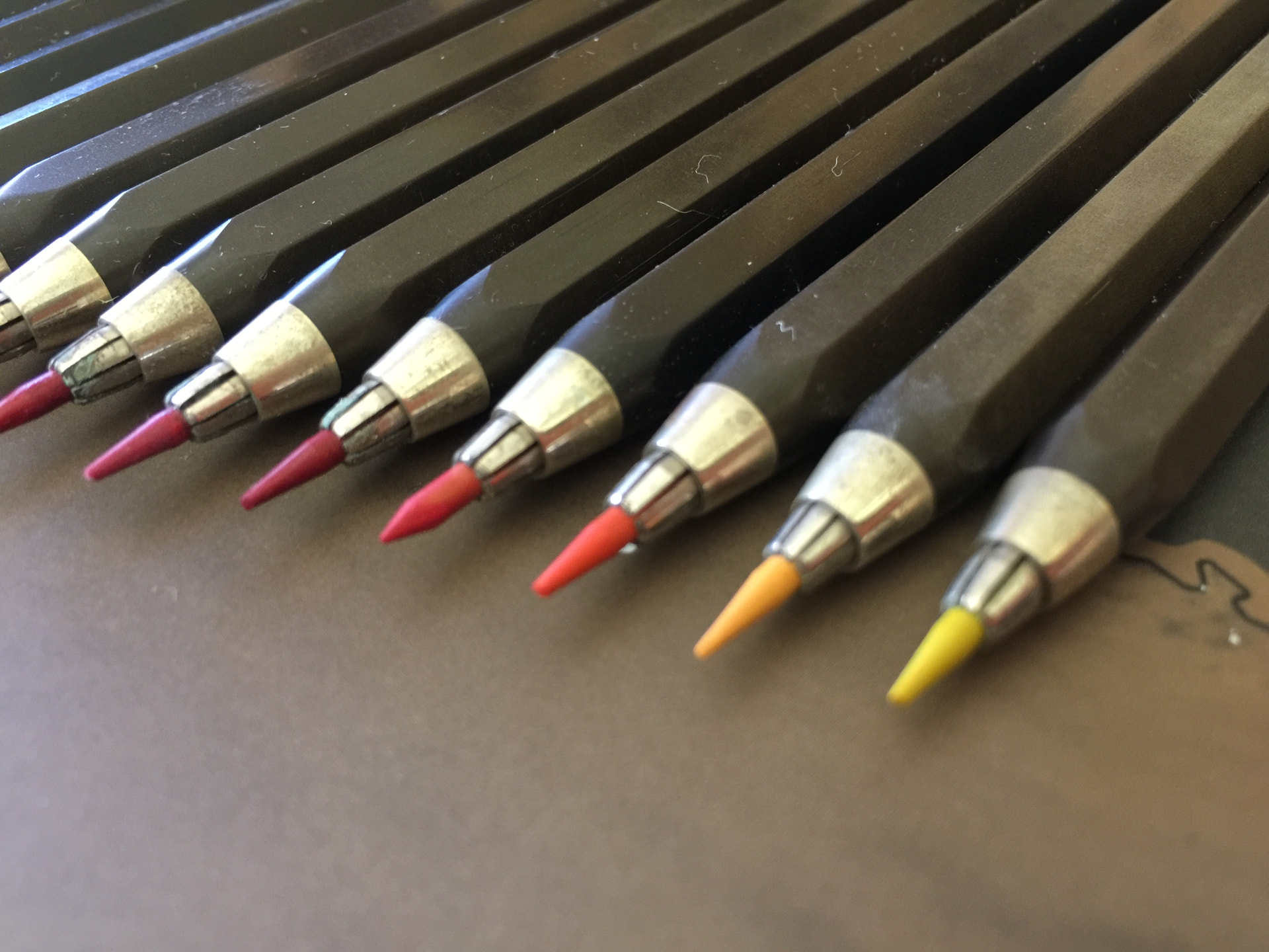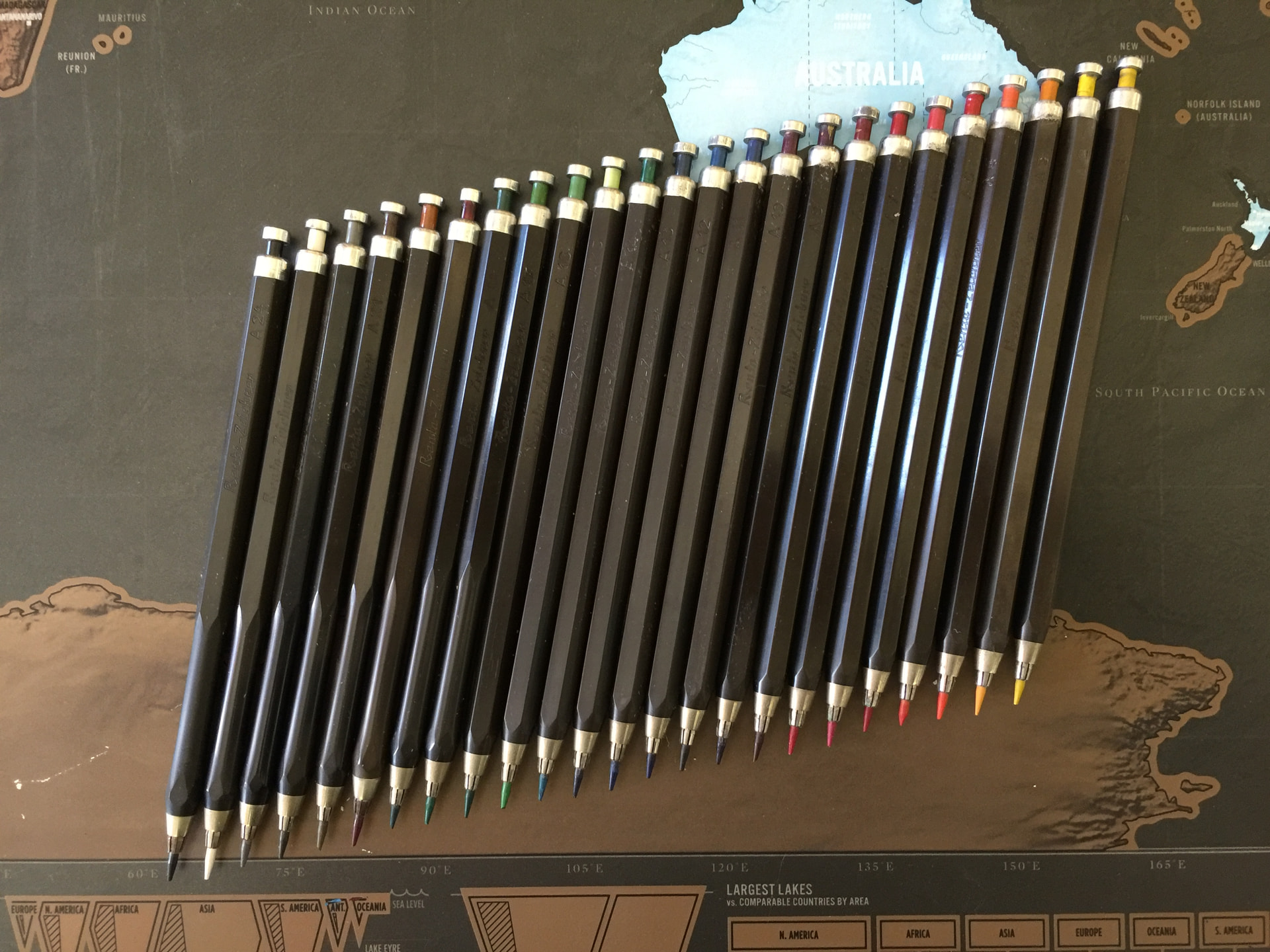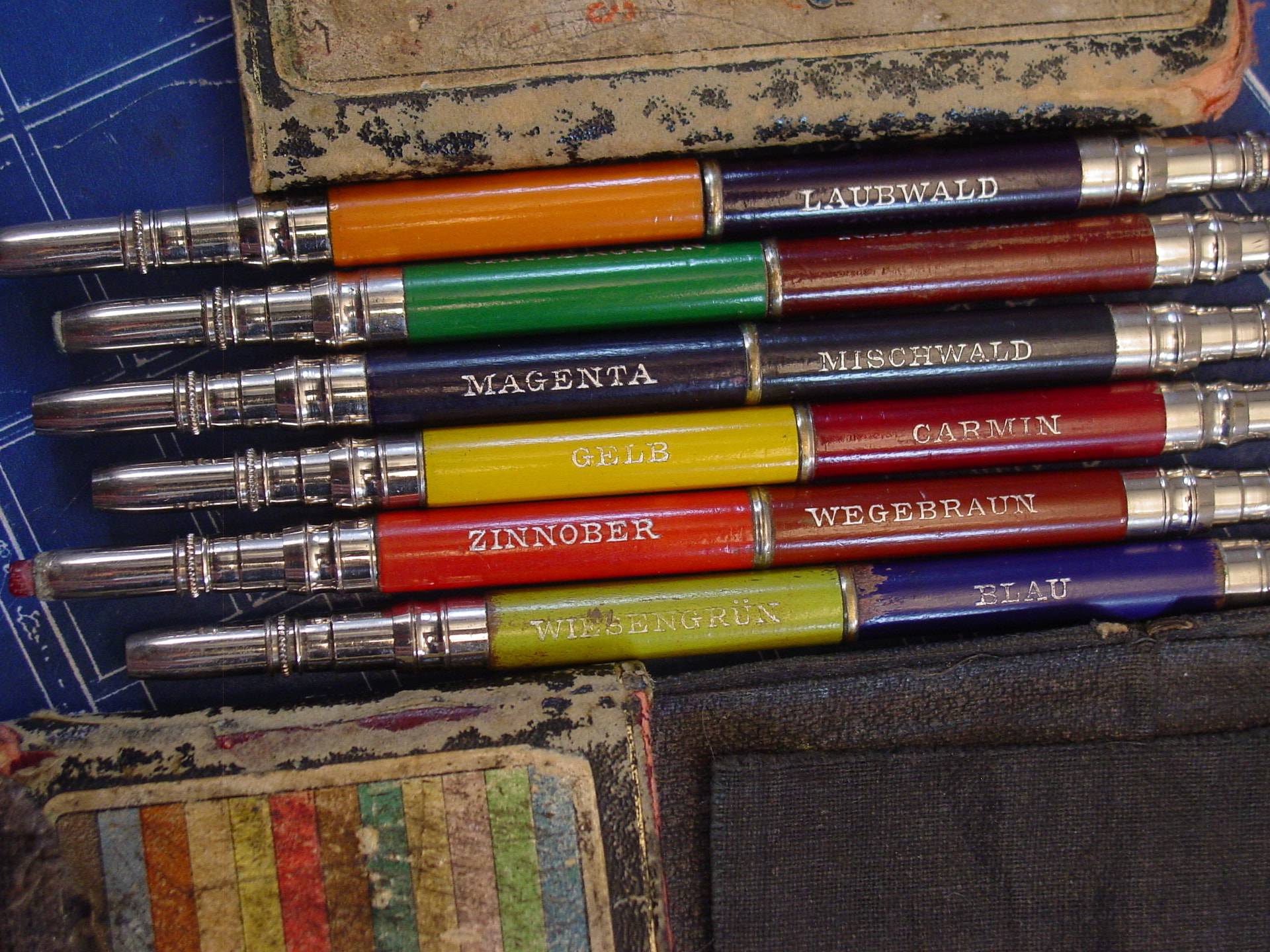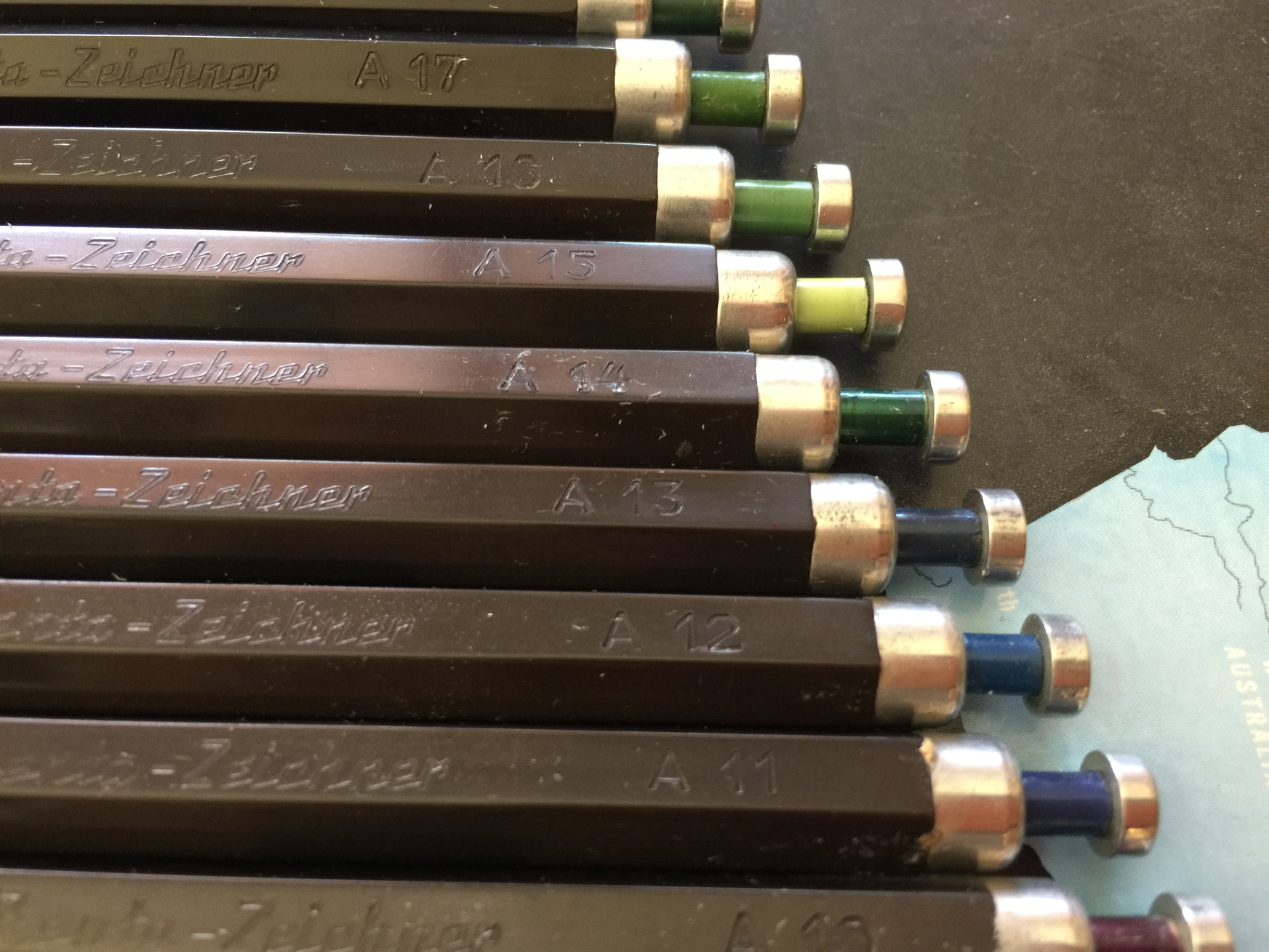 The ‘completist’ type of collector could easily spend years trying to find all the different colours of the Renta Zeichestifte. Here’s a group of 24 that came to me as a bunch many years ago so I’m not sure that they were ever a set as such. They have a great system of little colour sleeves that slide onto the push buttons. Curiously some have tapered barrels and some are straight so I think the two types were concurrent.