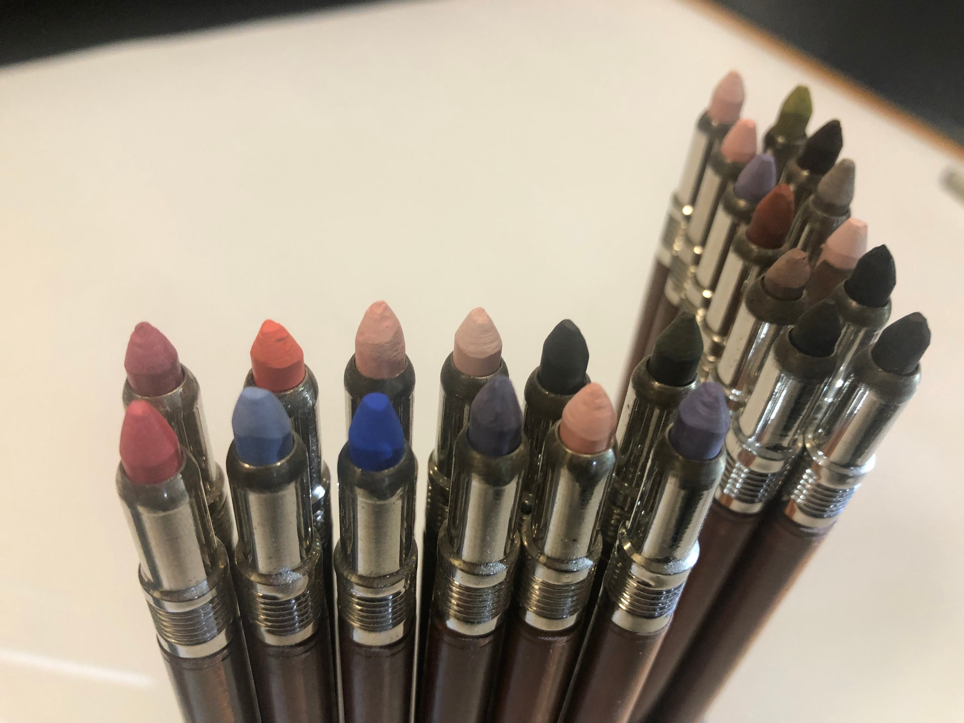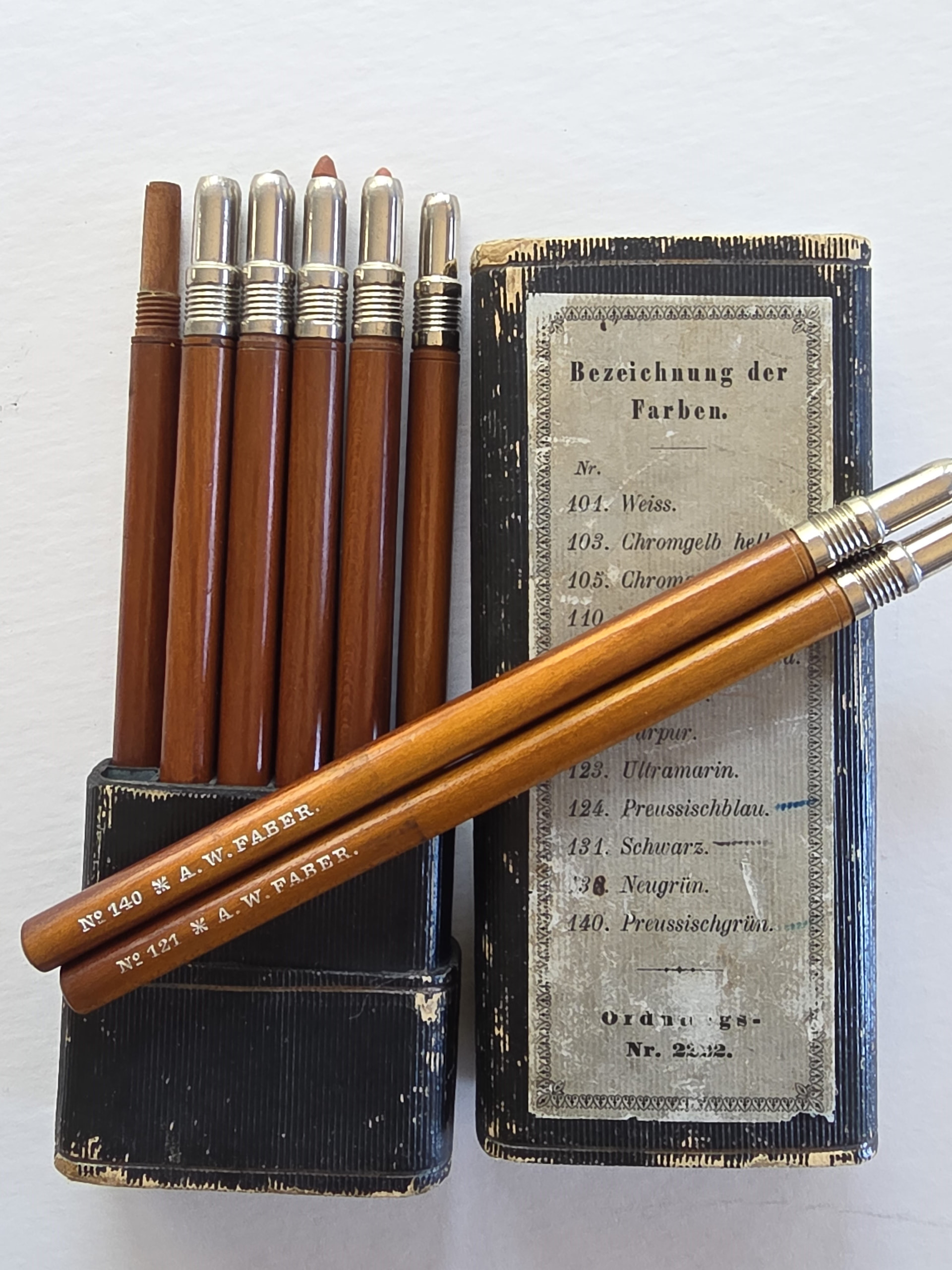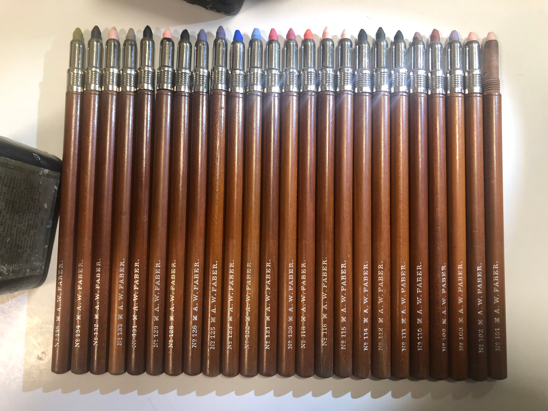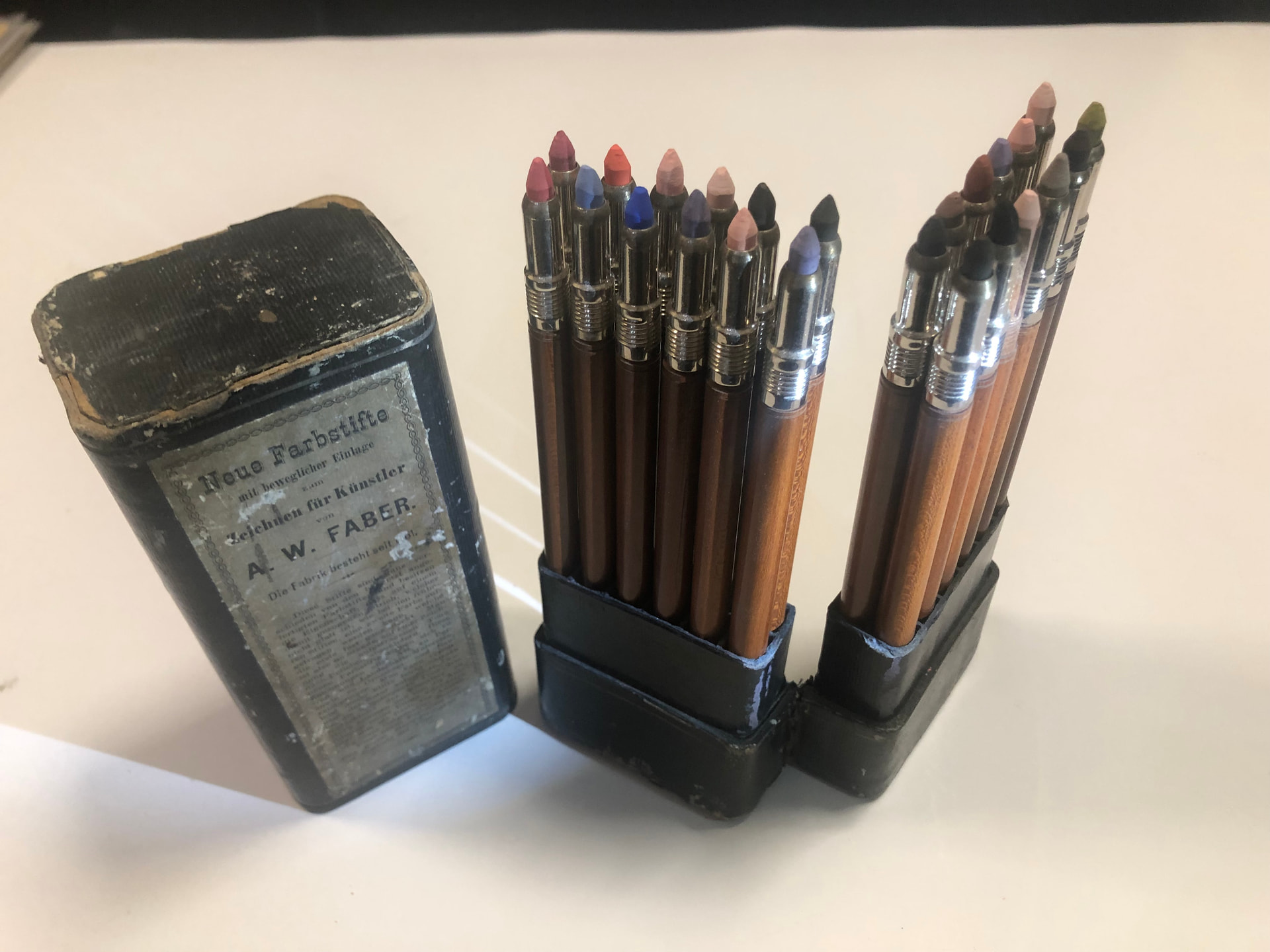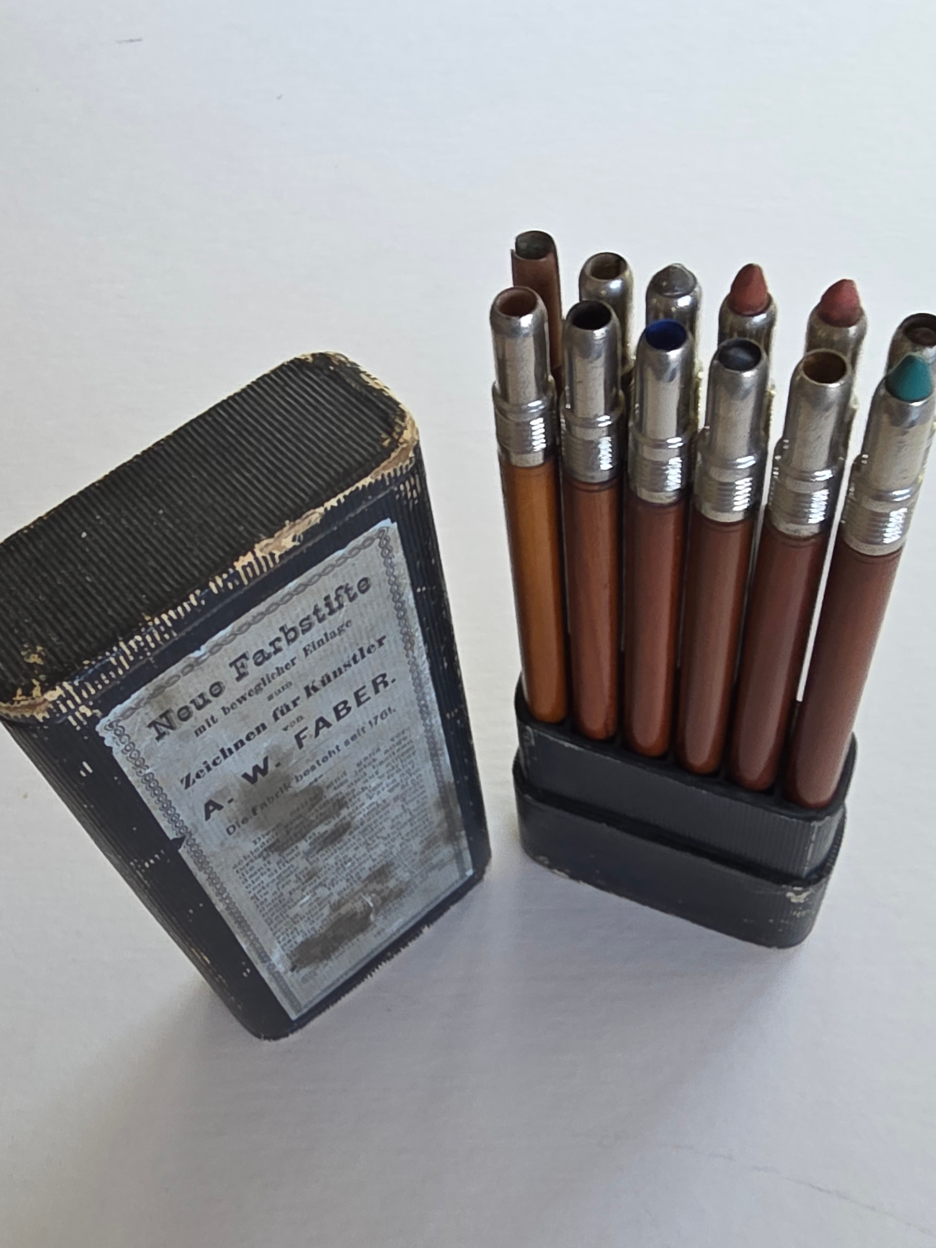 OK I’d better lead with something spectacular, probably the pinnacle of my collection. This is a A W Faber set of Chalk Holders from 1890 and they still have the original chalks in them. Only one chrome-plated nose-piece is missing. I’ve only ever seen one other set which was used and missing about three pencils. It was for sale many years ago by Andrey’s Pencils. Feaast your eyes folks!