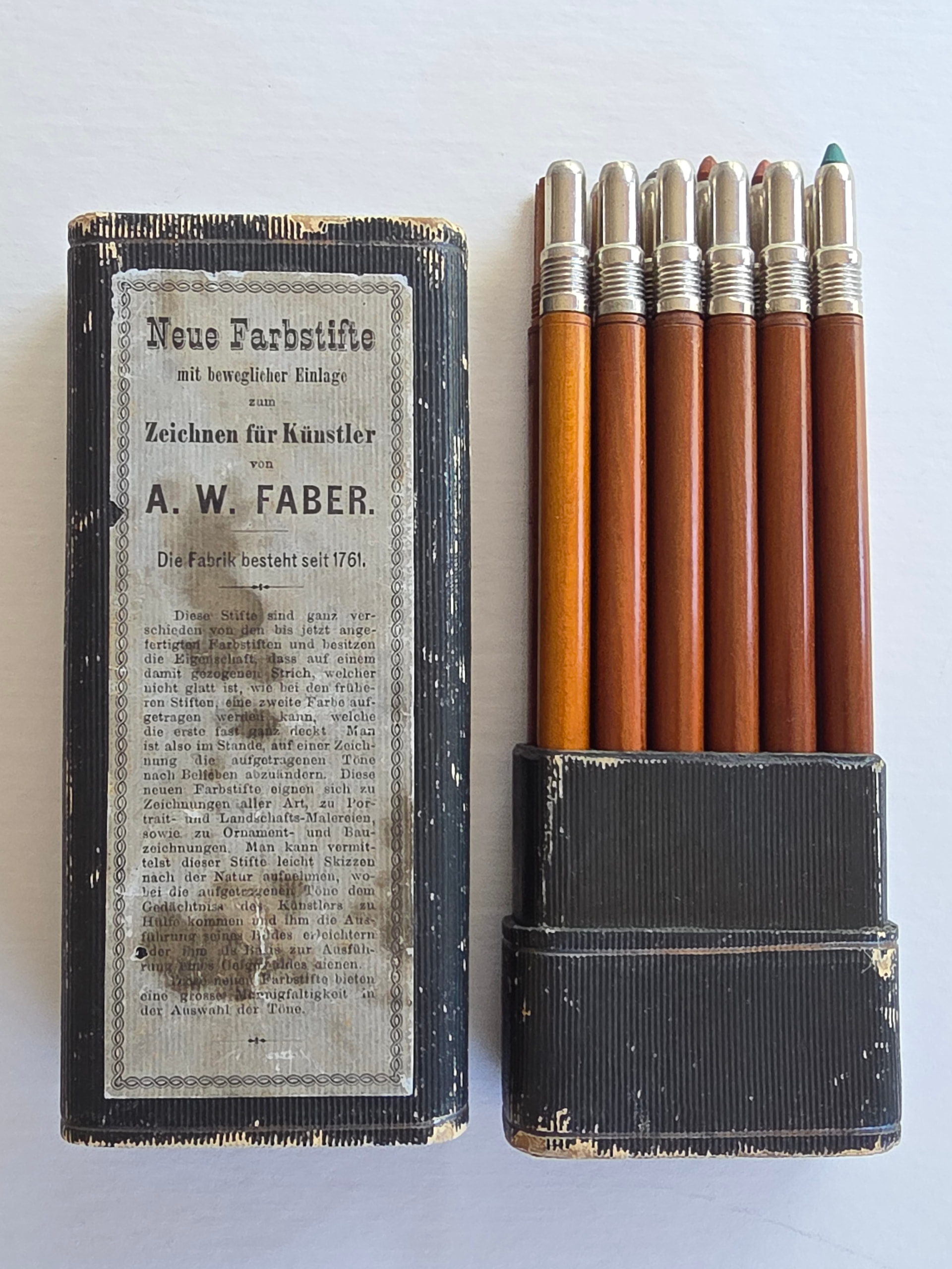These pencils are quite different from the colored pencils produced so far and have the property that on a stroke made with them, which is not smooth as with the earlier pencils, a second color can be applied which almost completely covers the first. One is therefore able to alter the tones applied in a drawing as desired. These new colored pencils are suitable for drawings of all kinds, for portrait and landscape paintings, as well as for ornamental and architectural designs. One can by means of these pencils easily make sketches from nature, whereby the applied tones assist the memory of the artist and facilitate the execution of the picture or serve as a basis for the execution of an oil painting.These new colored pencils offer a great variety in the selection of tones.
