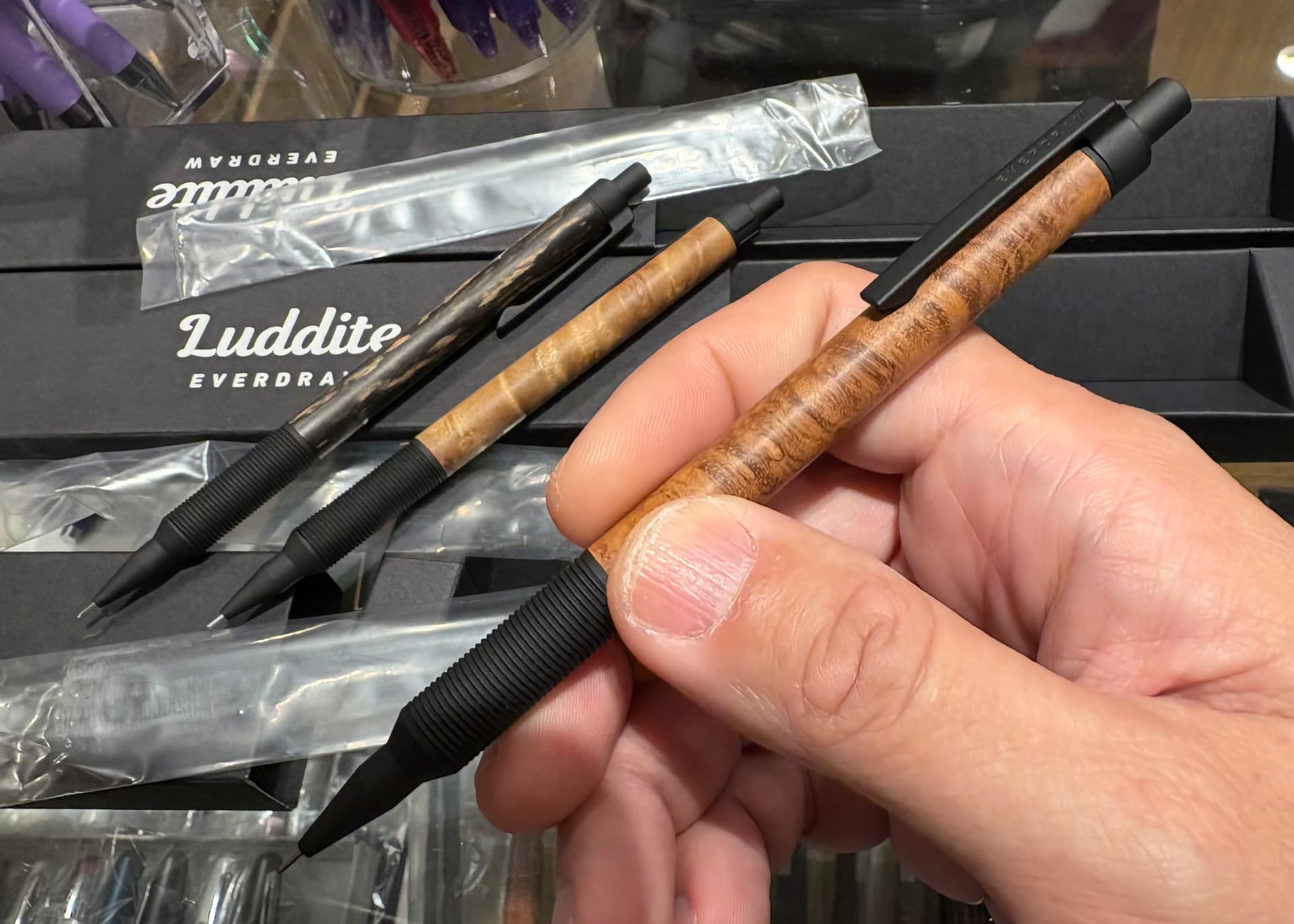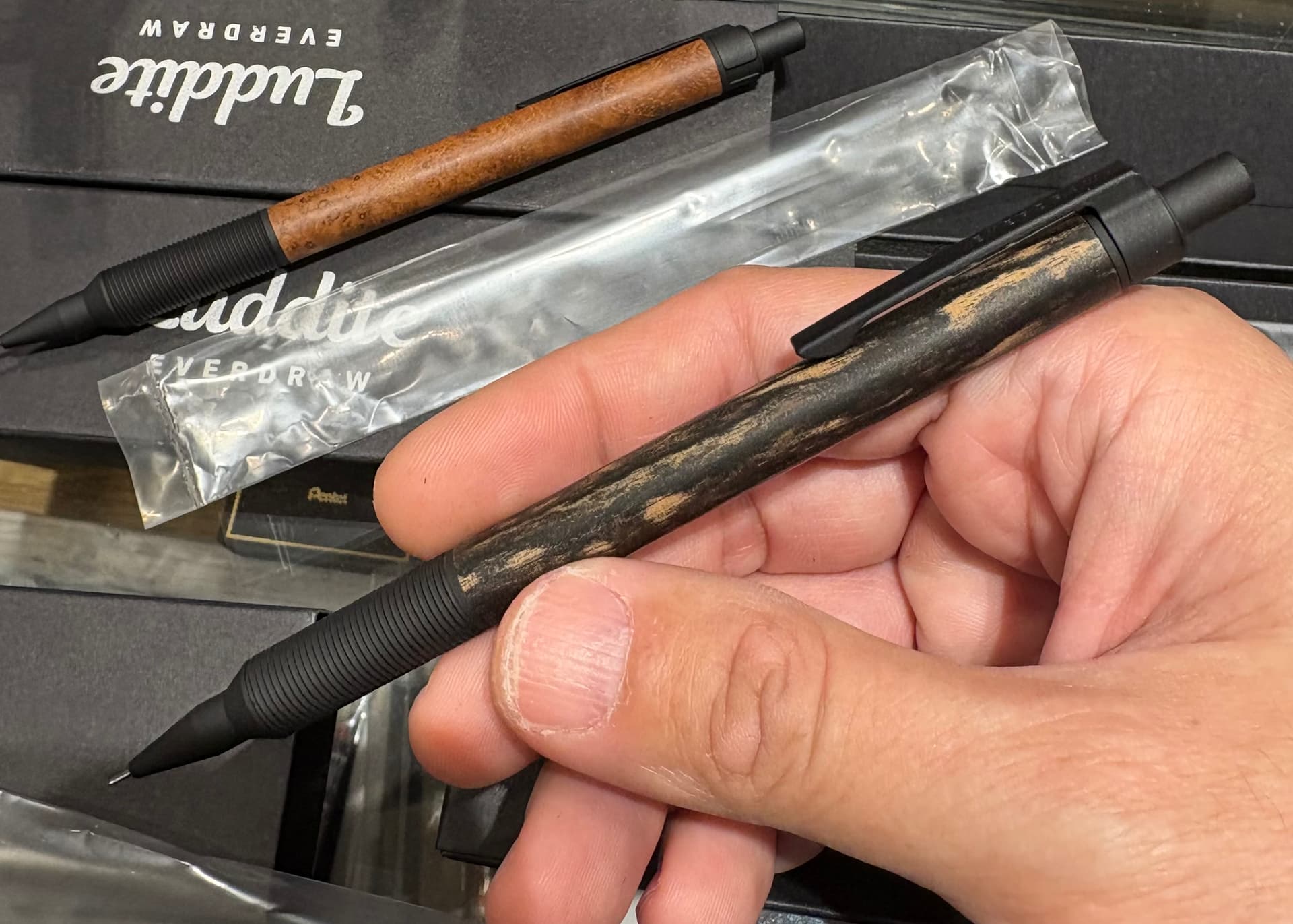 The event limited models are very cool and there were a few woods (mostly the rosewood curls) that I liked, but for 20.000 yen it’s too expensive and the grip I don’t like that much.