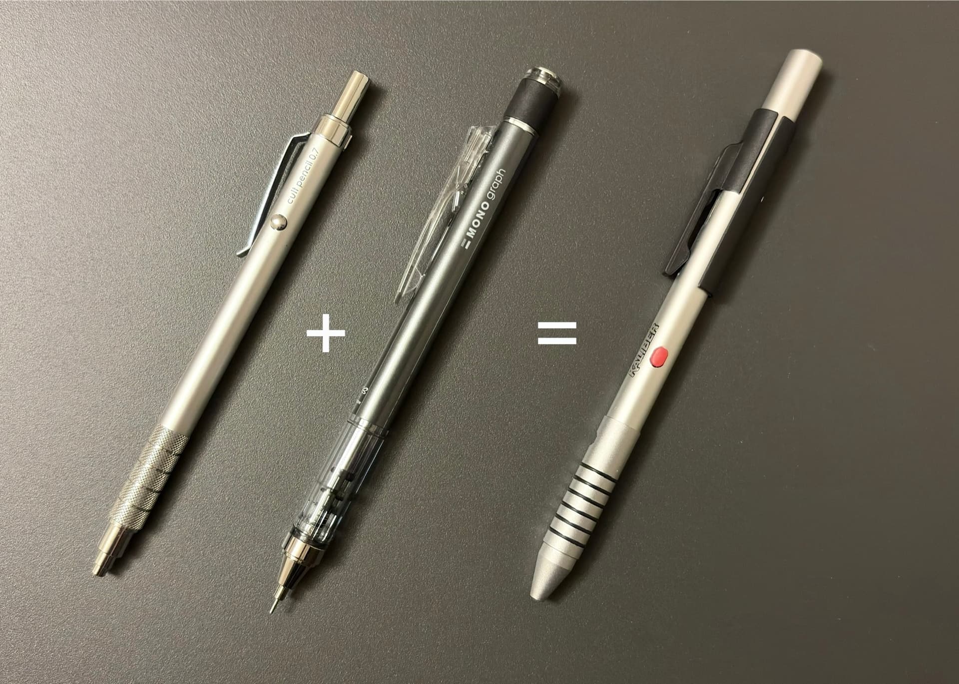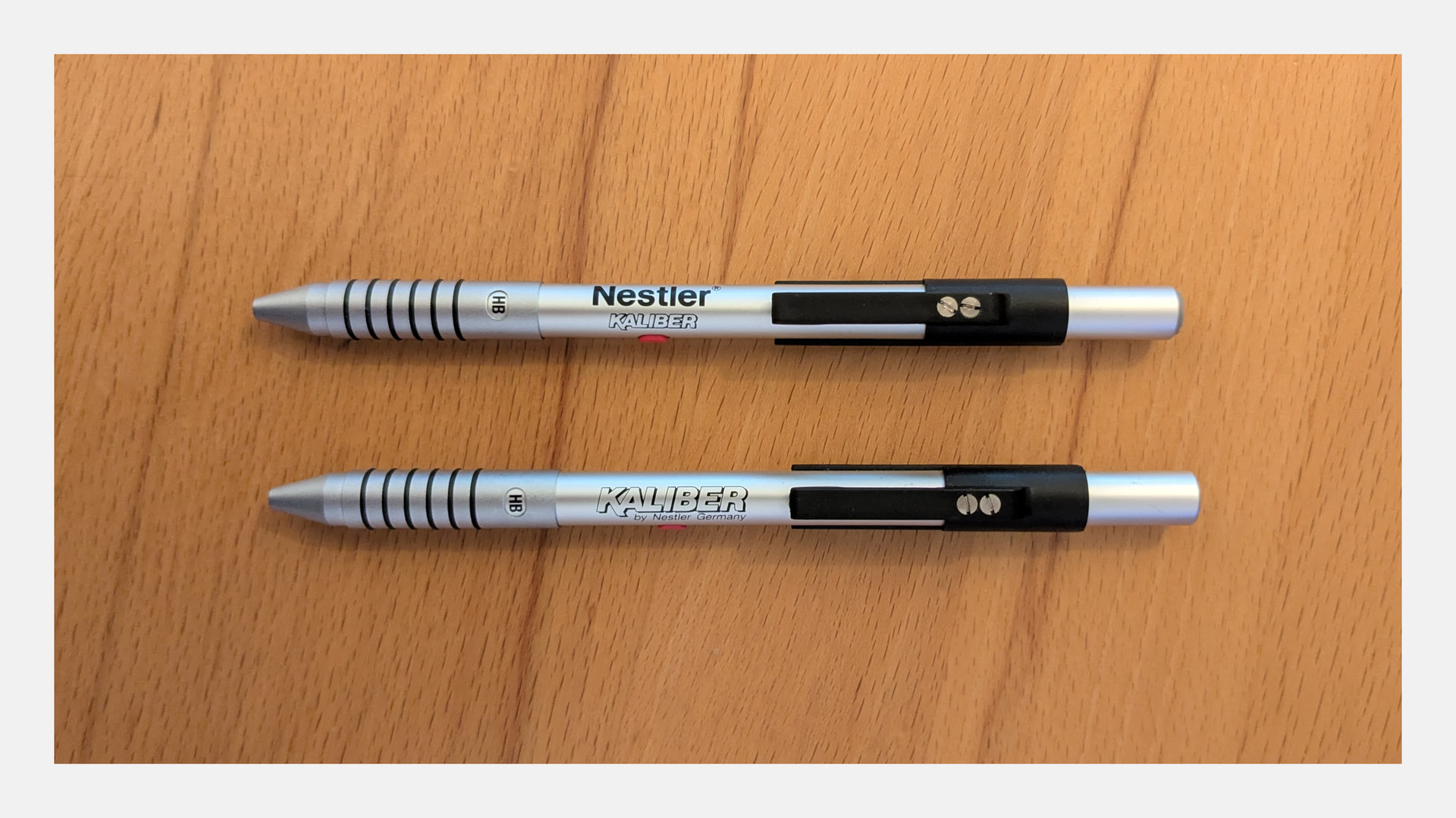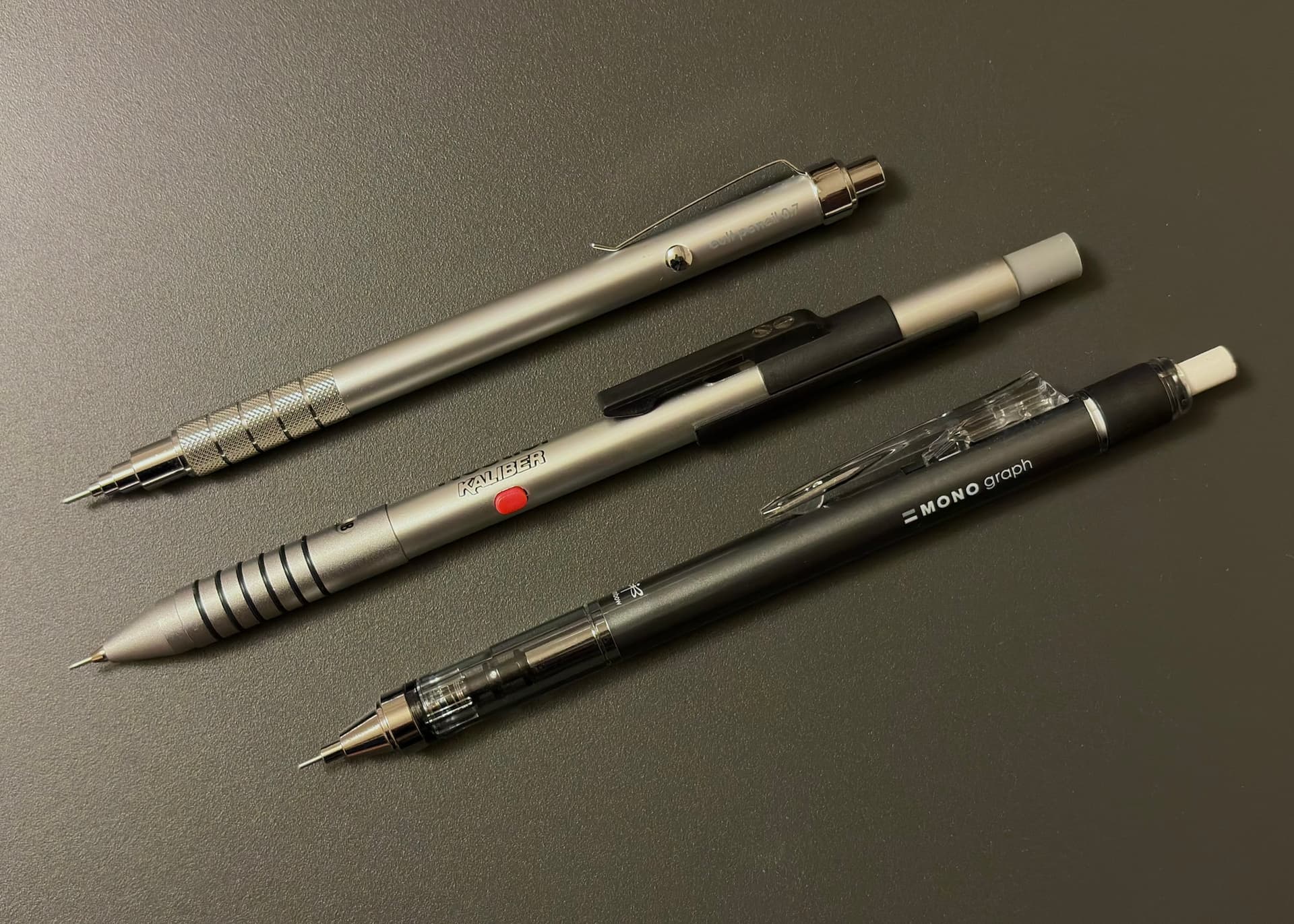 I can best sum up the function of the Kaliber as a combination of a metal bodied side-button double-knock mechanism like a Cult Pencil or a Manufactum Druckbleistift; and a clip-actuator plus extending eraser a la a Tombow MONOgraph. The main difference being that the eraser is a slide out affair instead of a twist-extender.