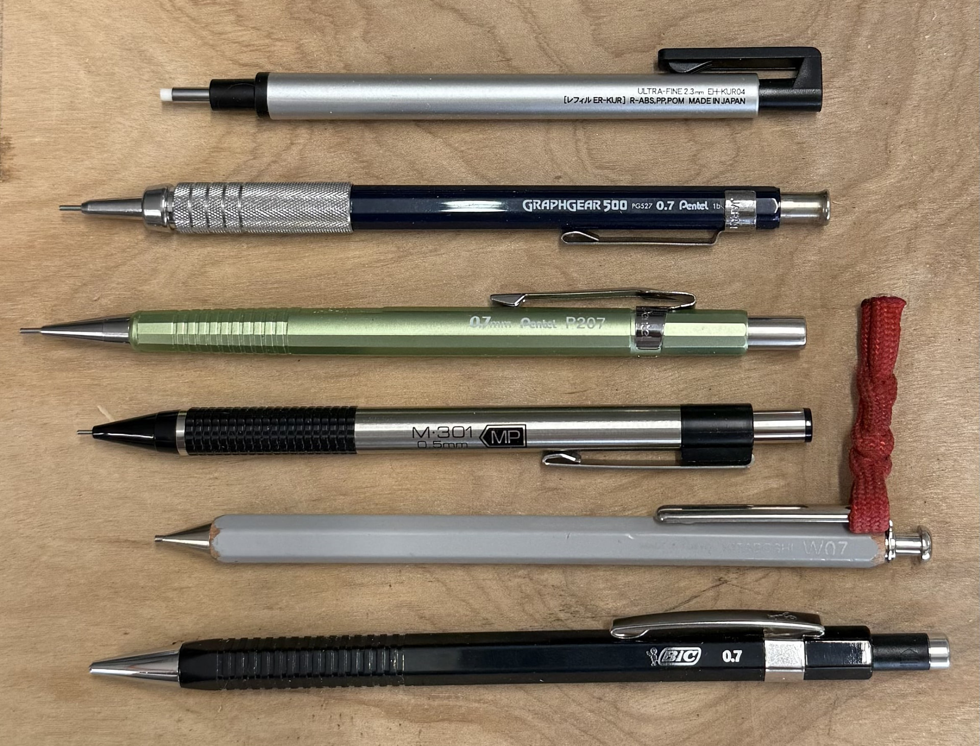 Hi, new to mechanical pencils! I retired and want to up my game in woodworking, so I need a mechanical pencil for marking cuts etc. I have so far a Kitaboshi W07, a Pentel P207, a Pentel Graphgear 500, all with 0.7mm leads, as well as two Zebra M301s with 0.5mm leads. I prefer Japanese pencils (and woodworking/mechanical tools).