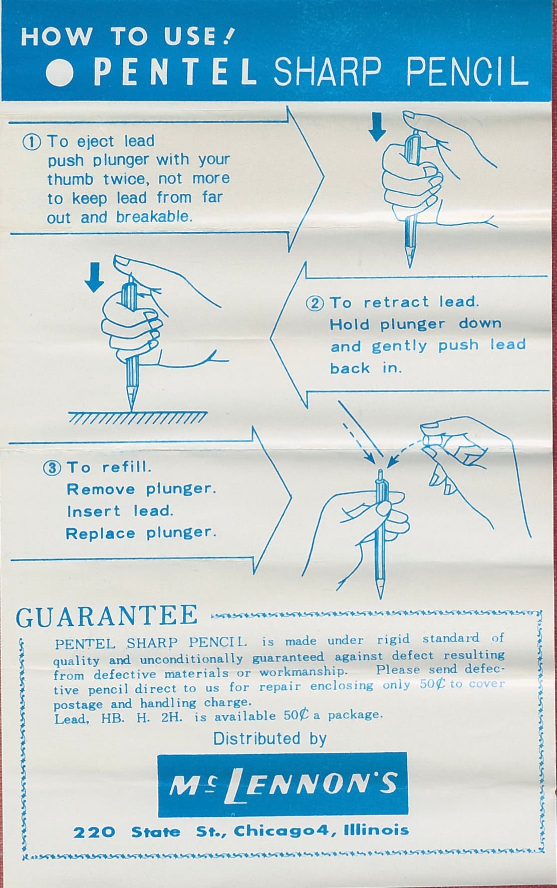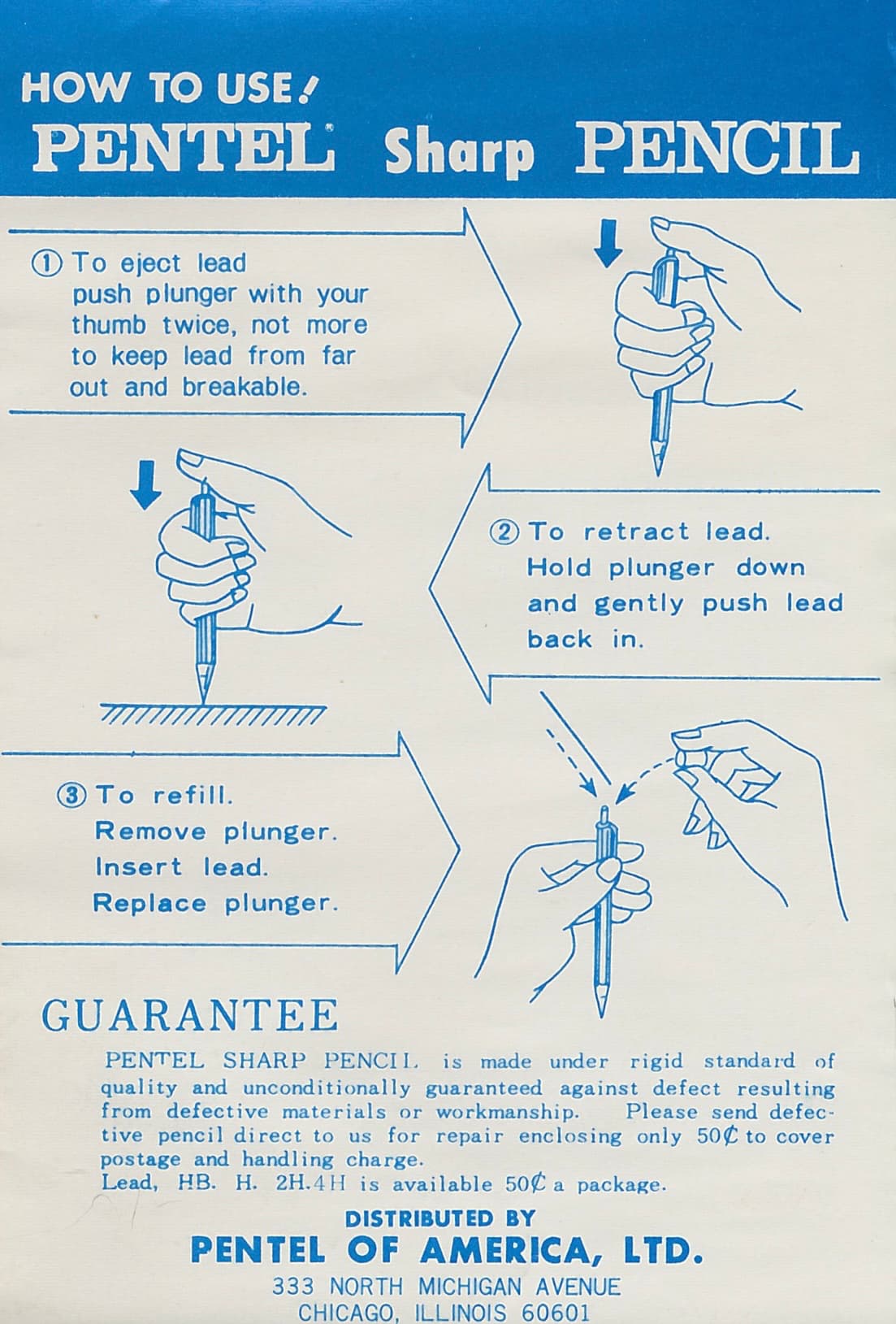 From what I can gather on here and Jimmy’s awesome Pentel Pencil Identification Book, this is the first mechanical pencil model manufactured by Pentel. I am guessing it is perhaps one of the first Pentel mechanical pencil models released in the United States by Pentel of America, Ltd., possibly alongside Pentel’s first PG model. The little sheet was rolled up inside the cardboard box. I never imagined coming across an item like this.