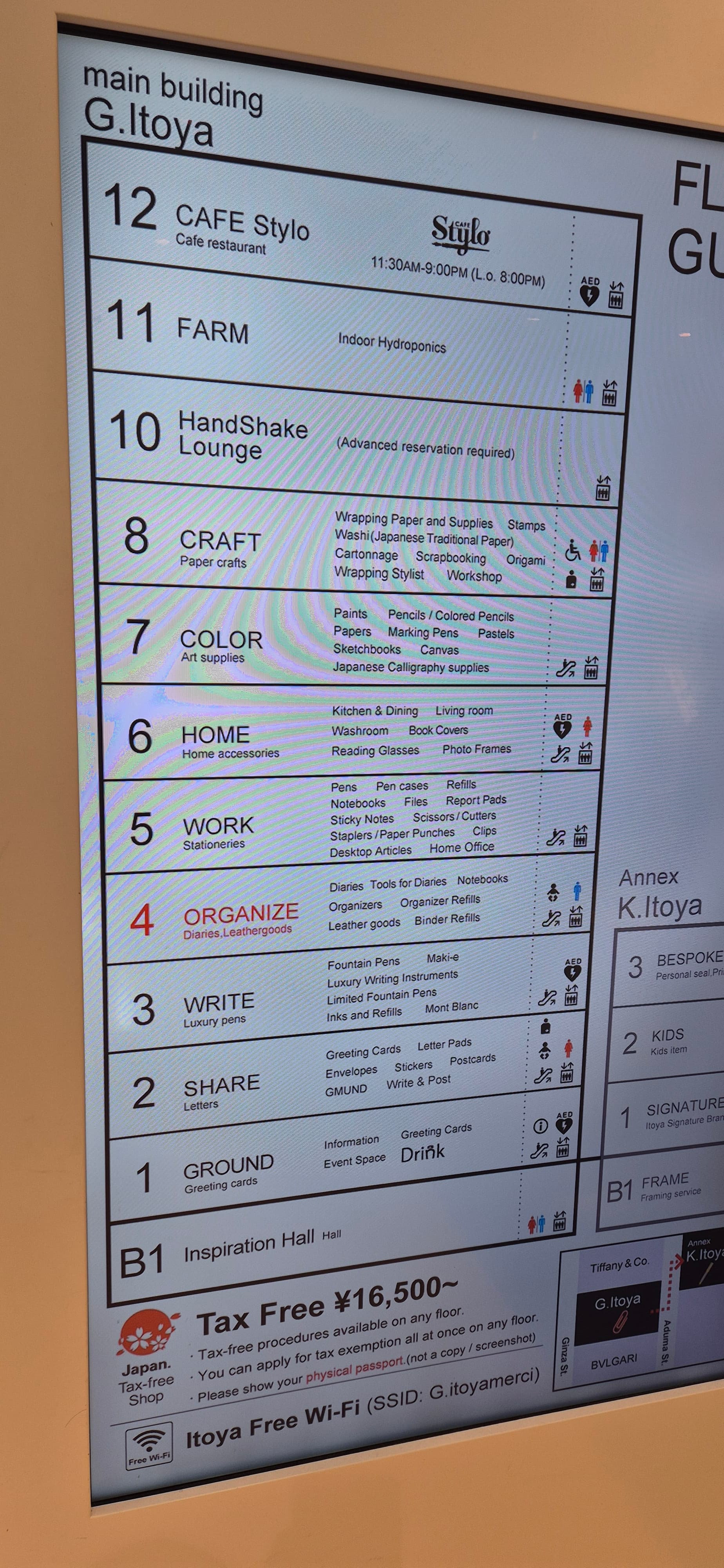 Re: Itoya, Ginza. Try to avoid weekend visits. The lift is small and dog slow. The pen floors are packed and no one is available to attend to you.