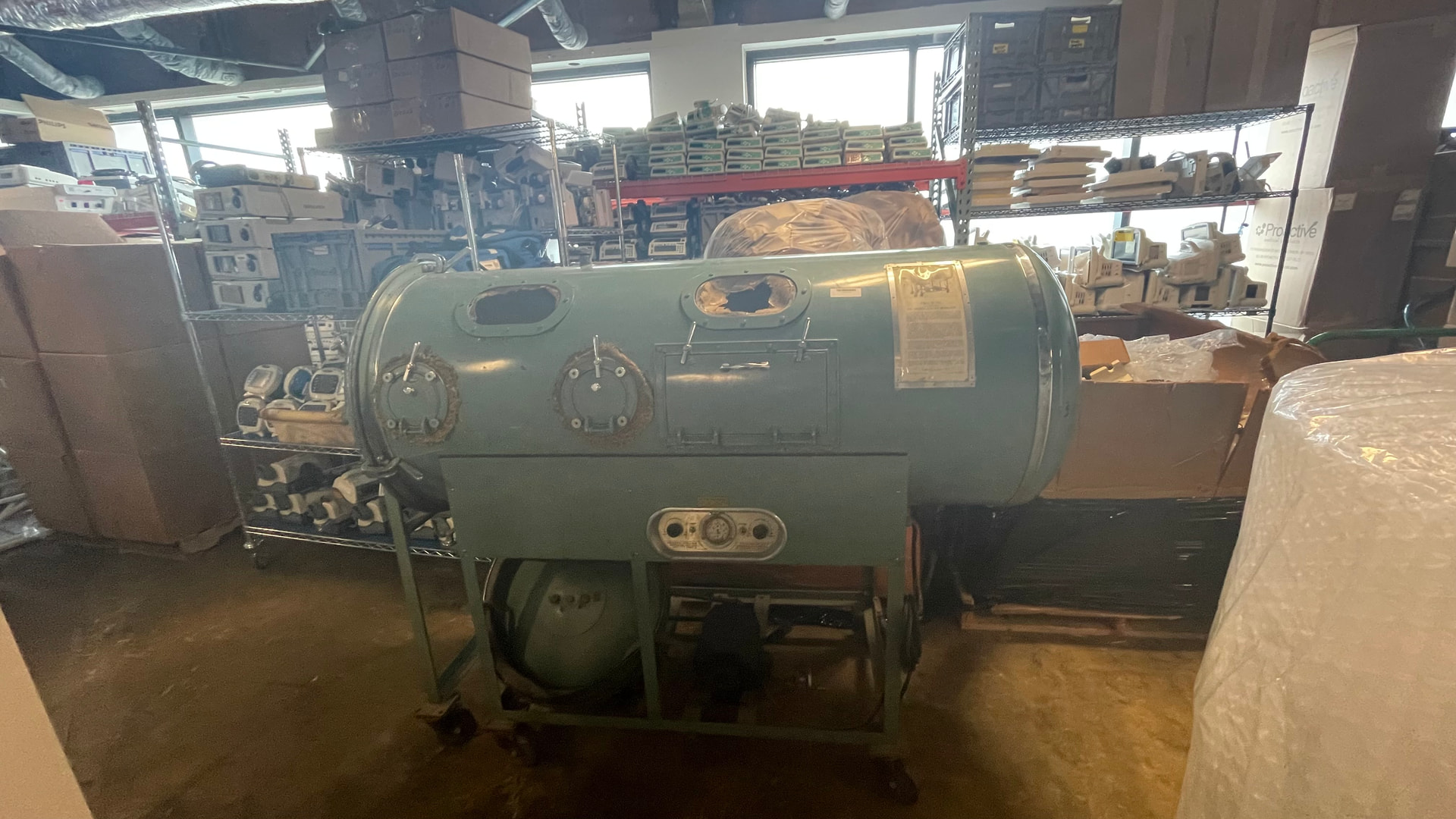 This showed up today. A 1950s era iron lung. We are going to restore it and put it in the lobby of our repair depot.