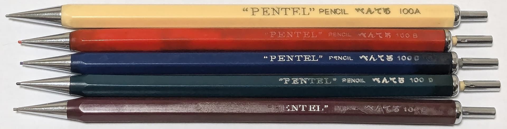 Release 1 - Generally acknowledged as the first Pentel mechanical pencil released in 1960, the model 100 has Pentel in Quotes, Pencil and Pentel again, this time in Japanese, then the Model Number and the color code without a space.