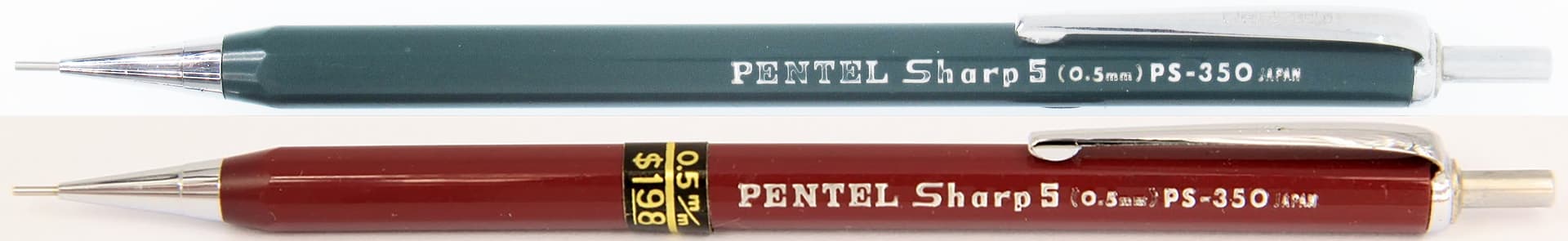 All new text layout, including the “Sharp 5” and PS- (Pentel Sharp?) in front of the old model number. Now just JAPAN instead “Made in Japan”. Color code has been dropped from the side.