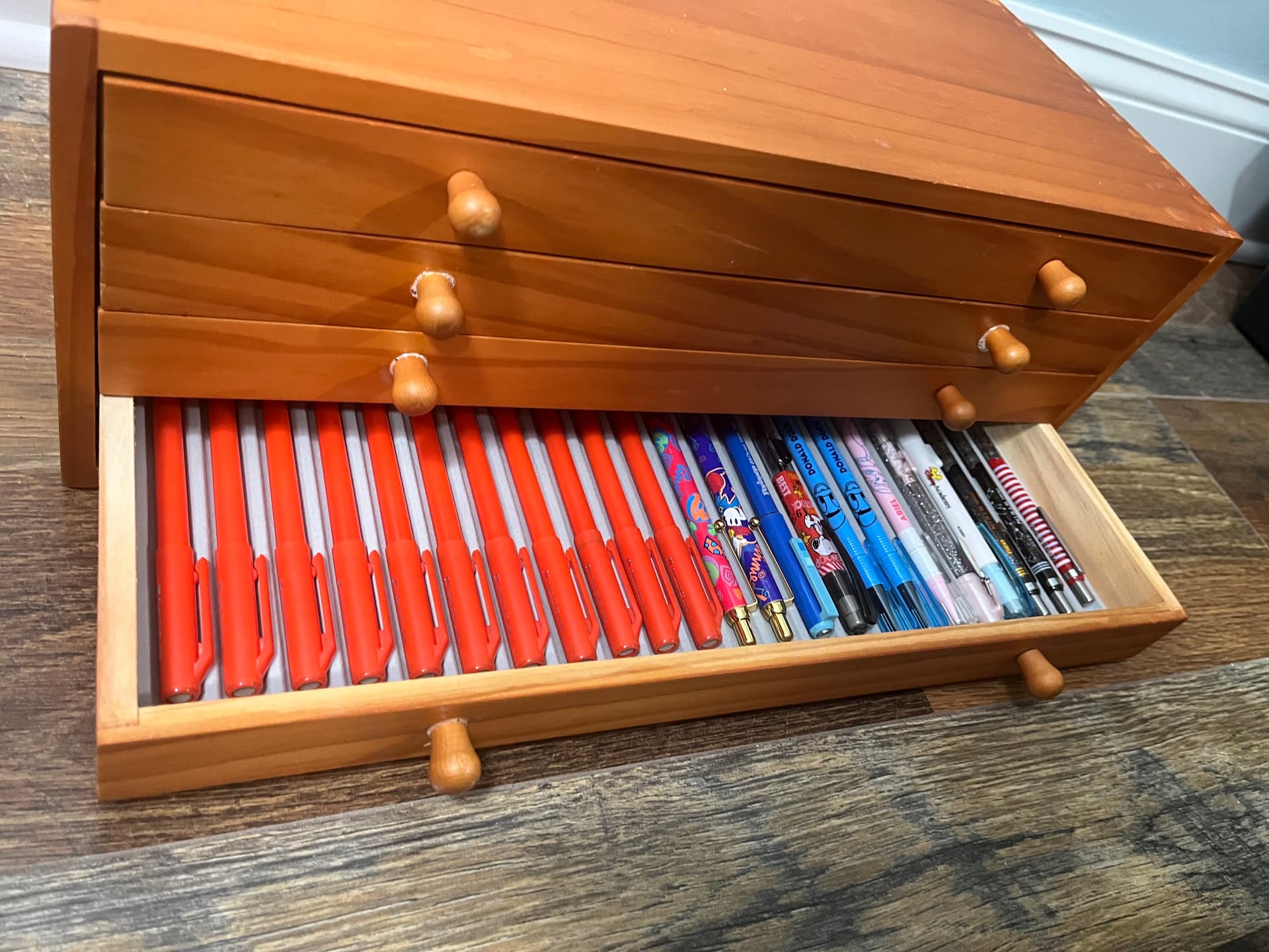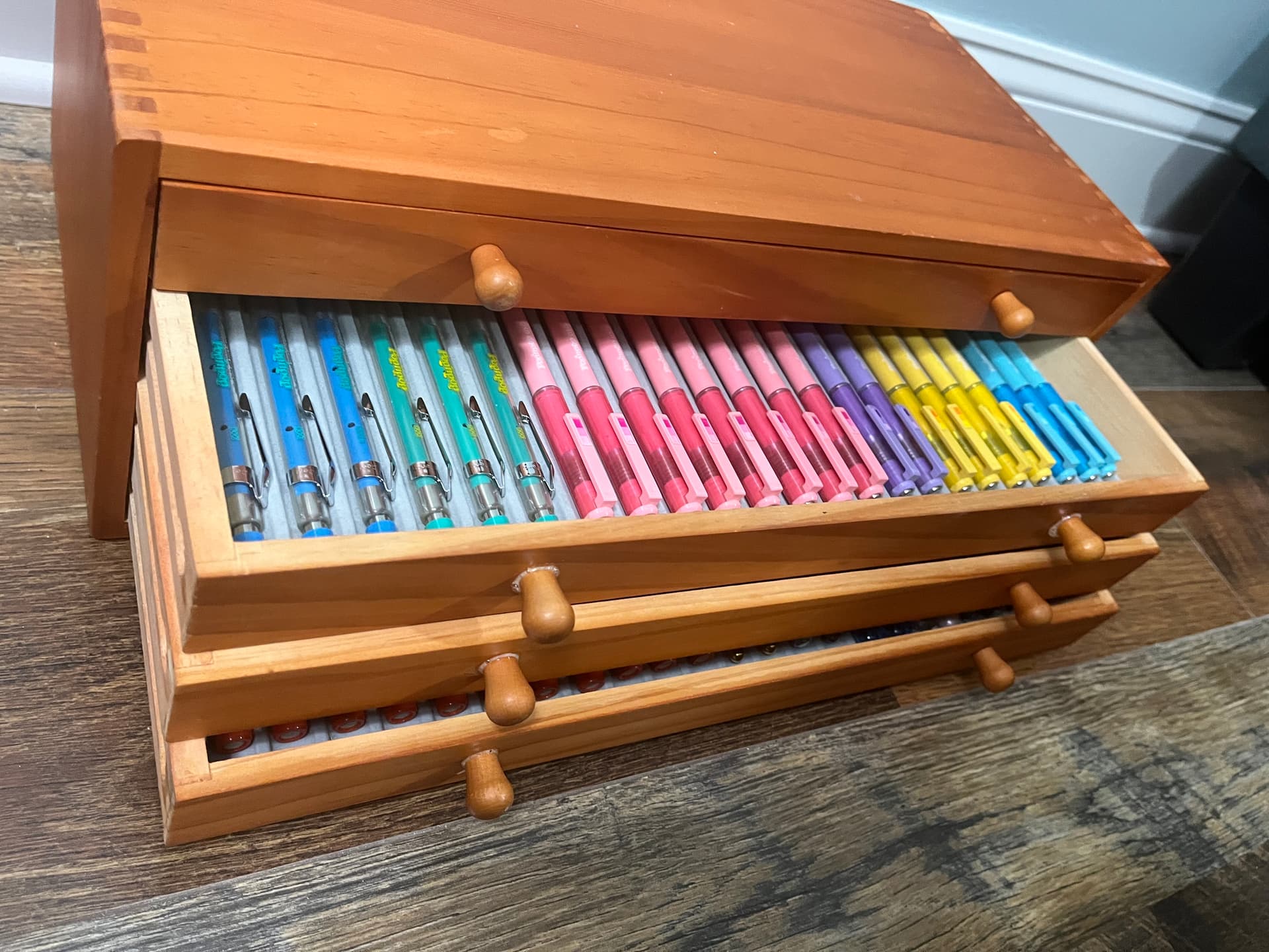 Hello! I’ve been working for quite some time on a storage solution. I finally found an answer that works for me. It’s a 9-drawer cabinet. Here are some pics of the first drawer filled with some Pentel twist erase models:
