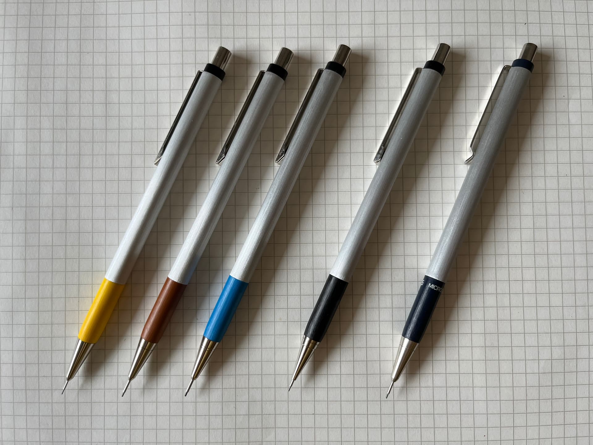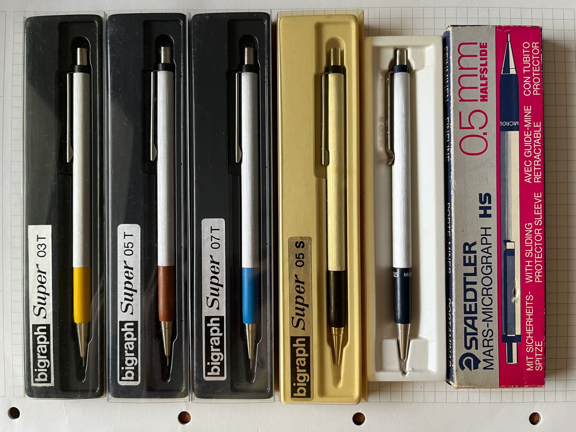 Delightful sub-collection! To add a little facet to the story, I think Bigraph models were acquired and rebranded in Italy by Norex; the “Norex Micromina” series offered 0.3, 0.5 and 0.7 models — if I remember correctly, not with the coloured grip area, though: only in plain metal and black grips — and the 0.5 model for sure could be available in fixed sleeve, half-slide, and full-slide sleeve.