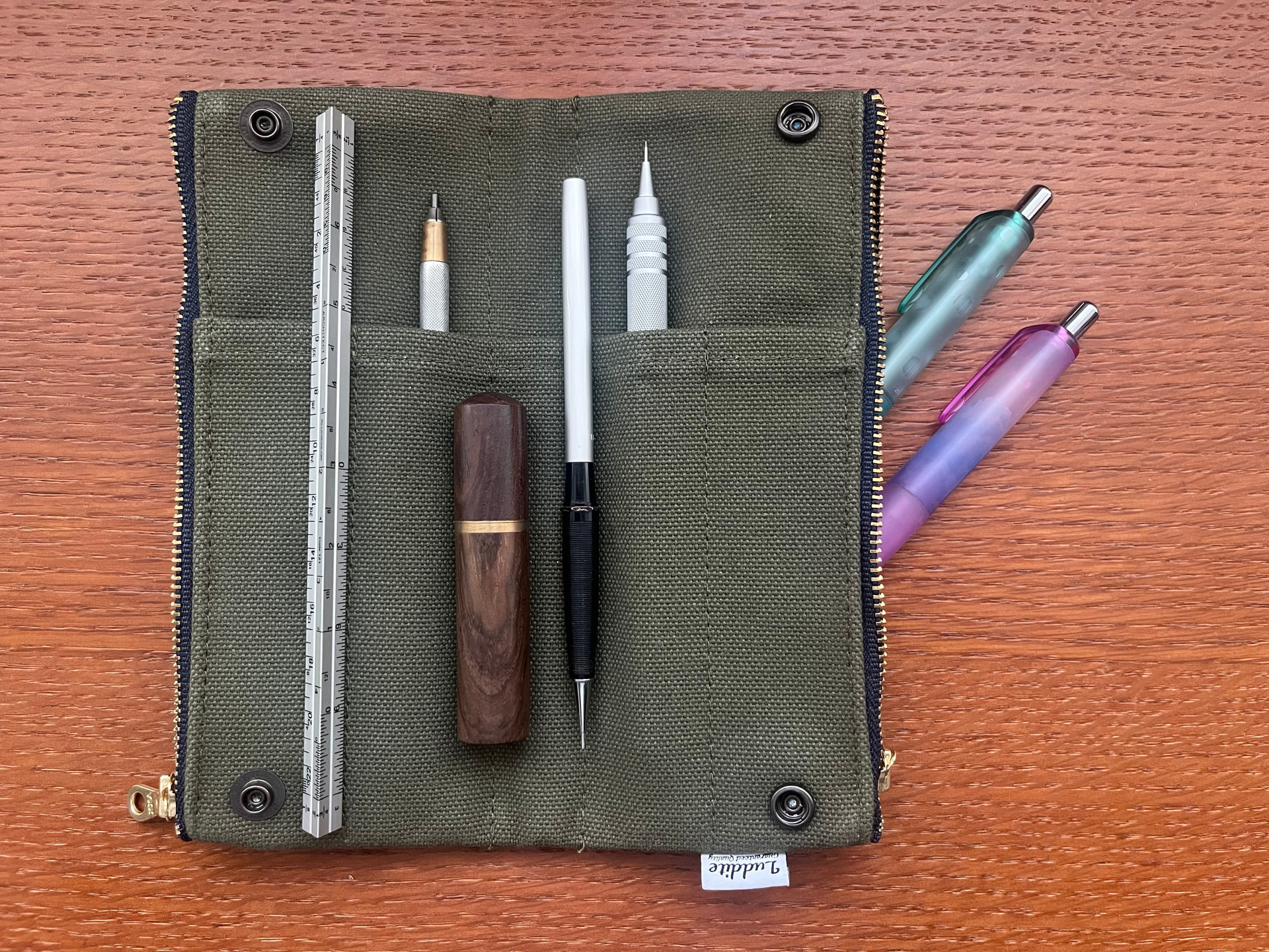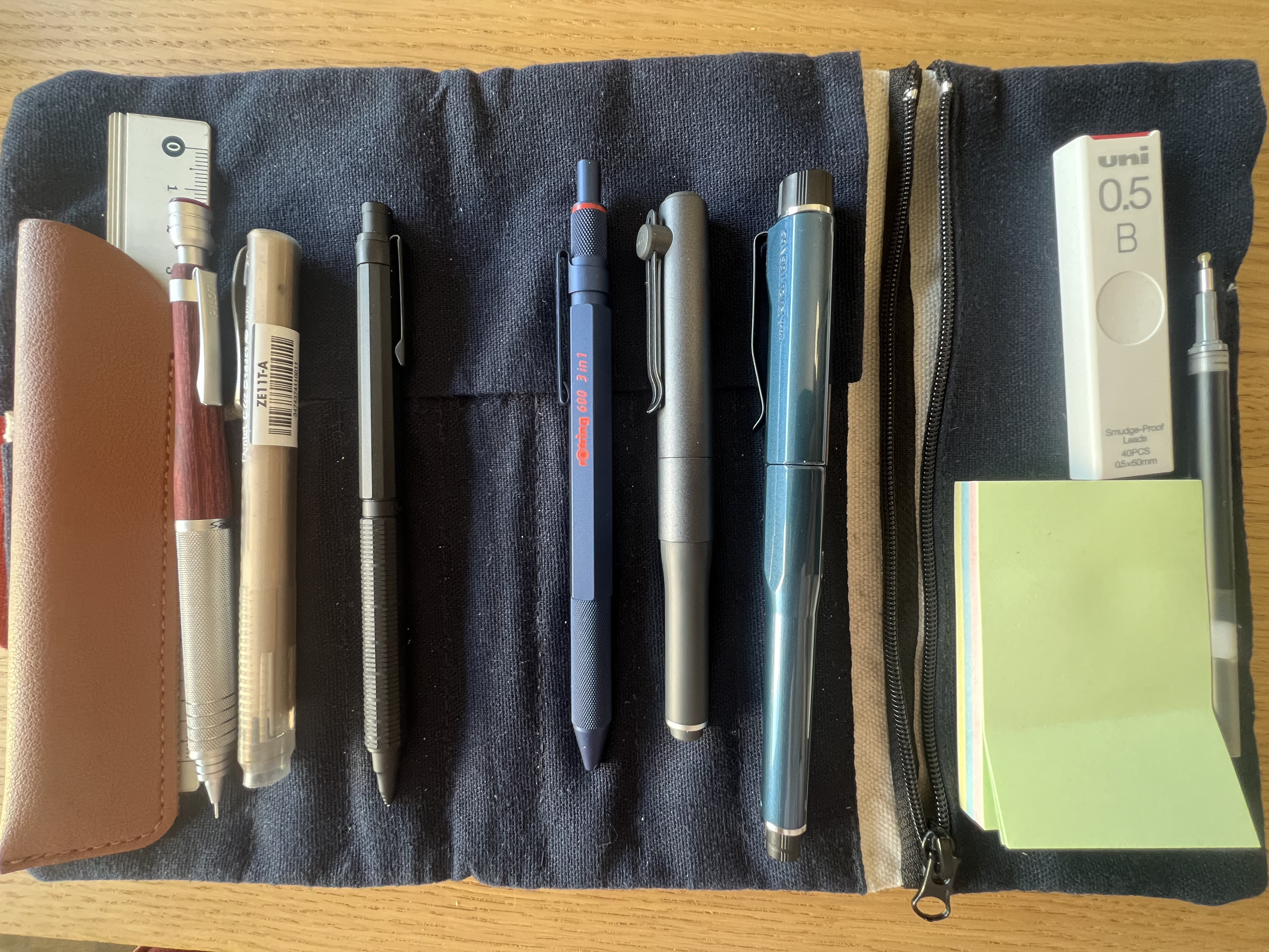 Front half of a Niji Grip 350 DX in a cheap Chinese fountain pen body. Shares a pocket with keys and occasional coins.