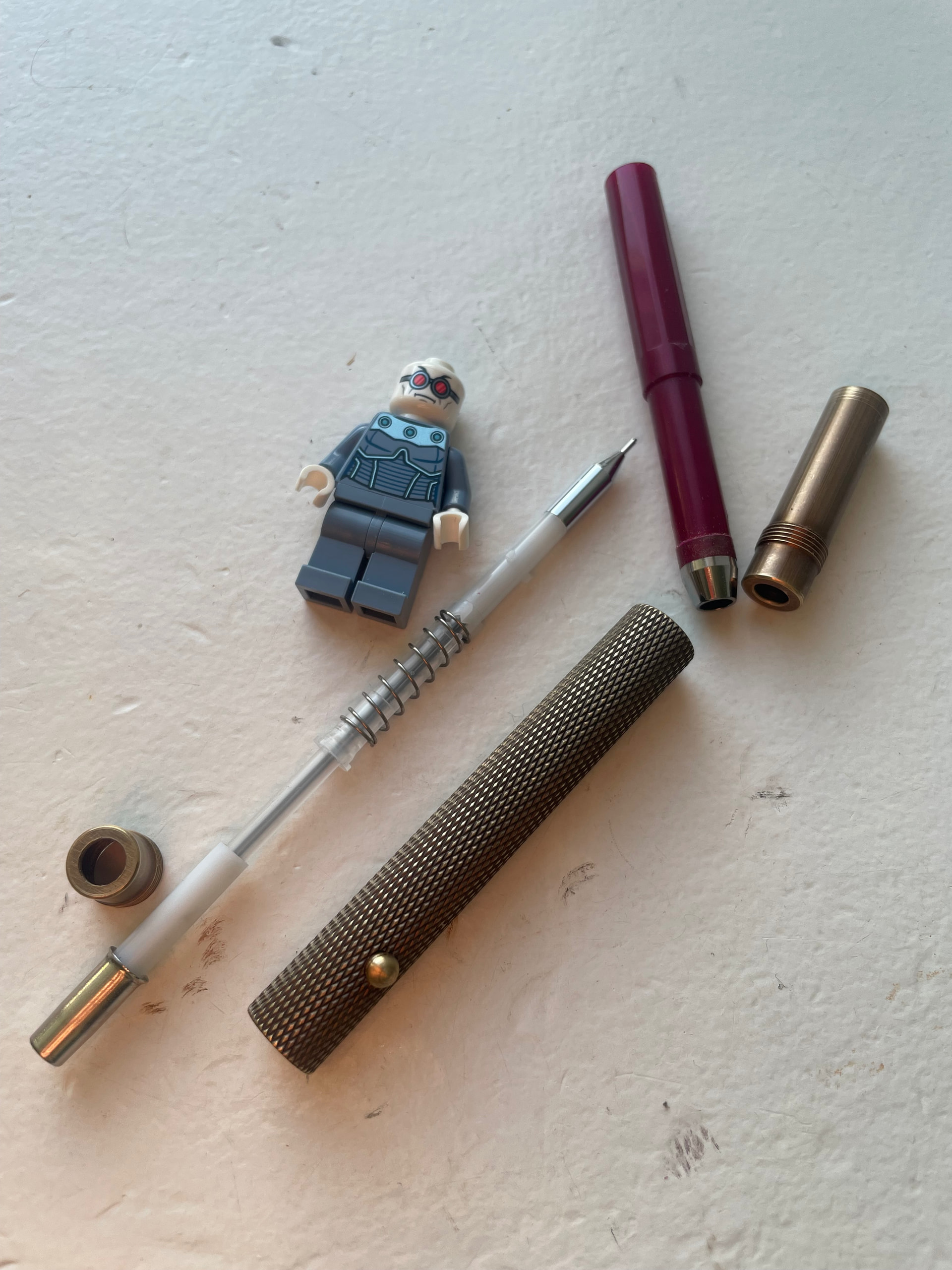 I decided on a shorter ballpoint clicker and having permanent tension on the spring, to make it shorter than otherwise possible.