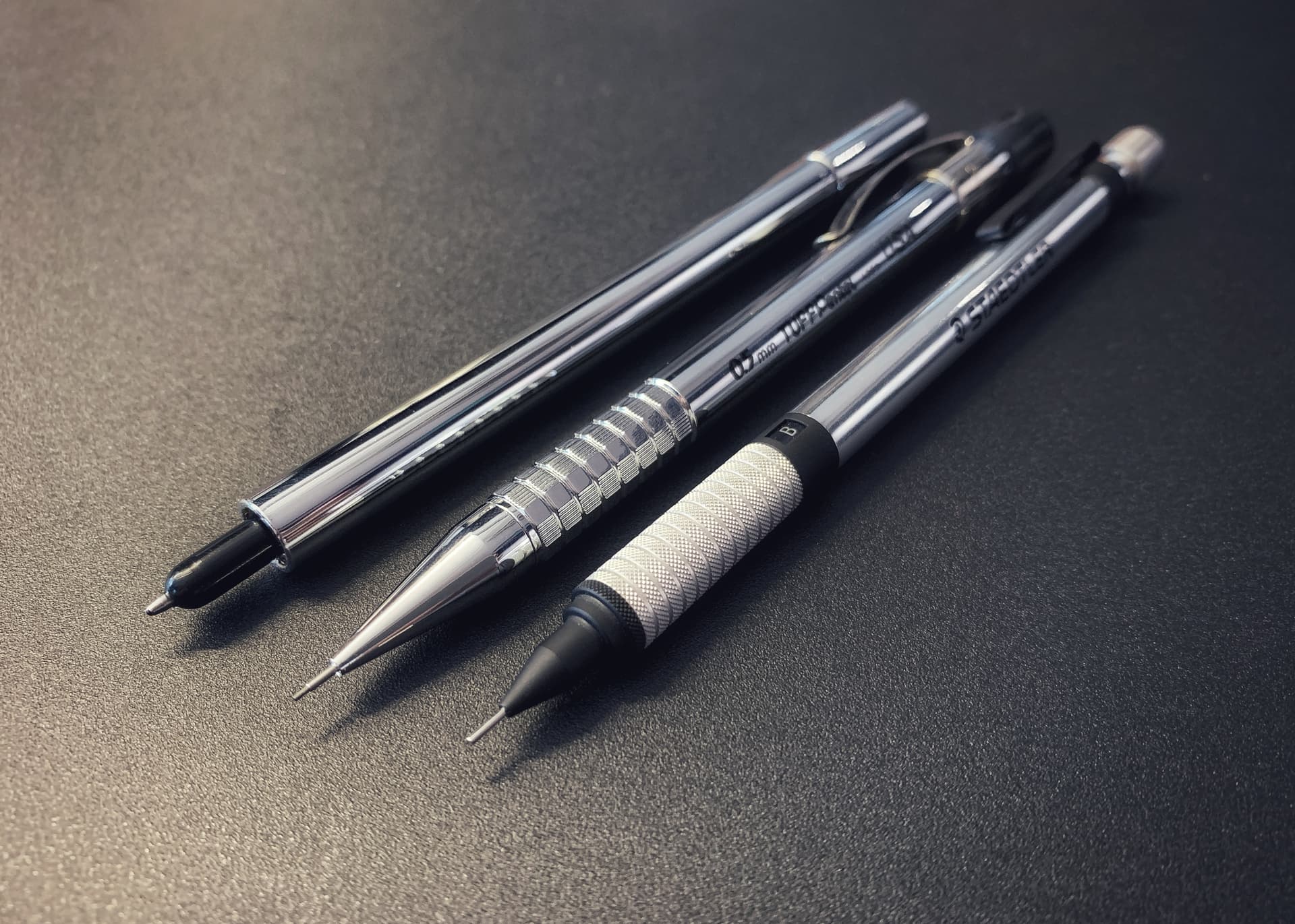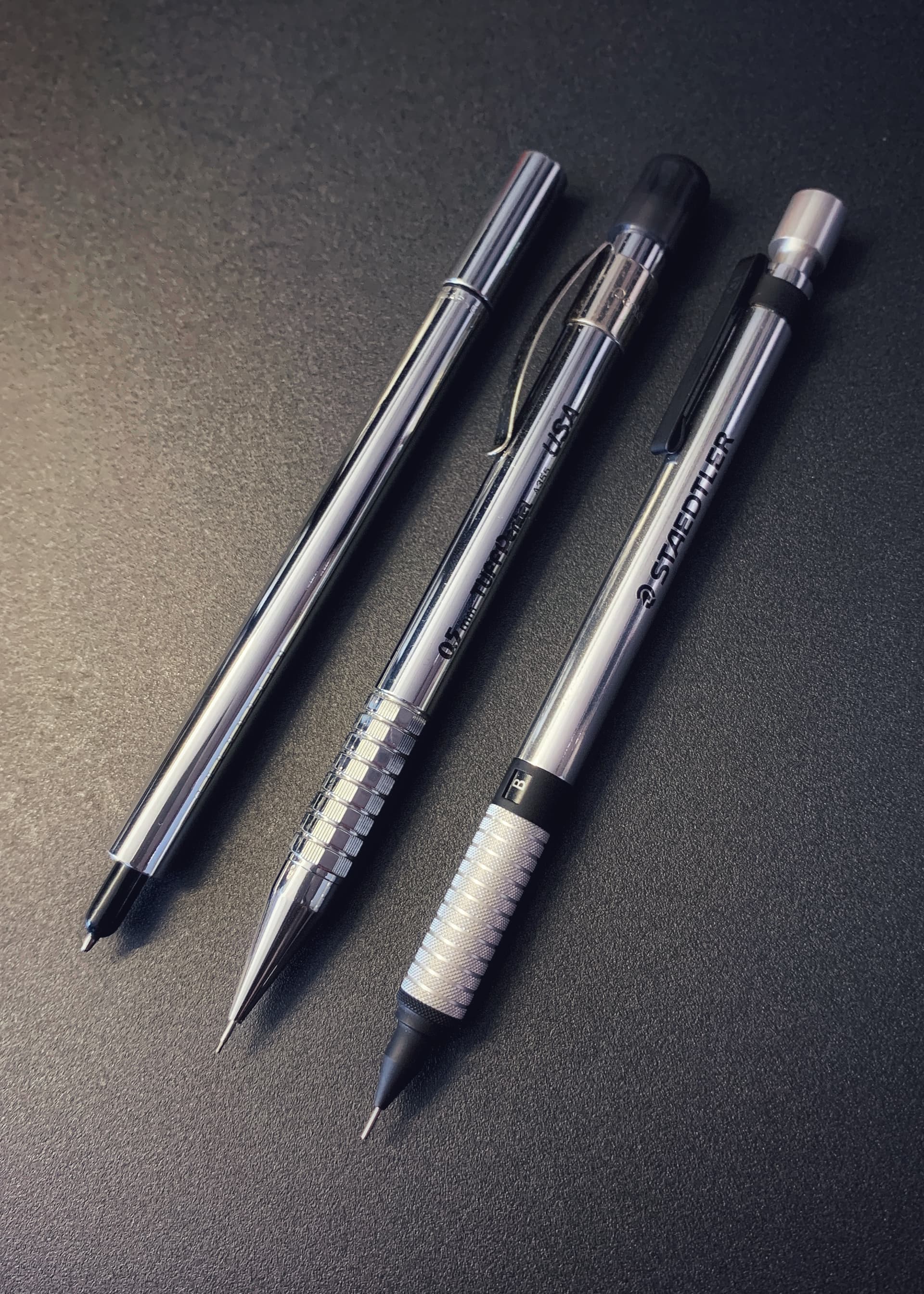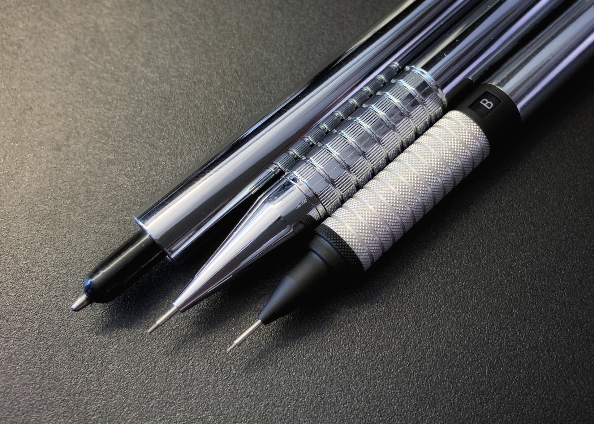Shiny cylinders for the week… Parafernalia AL13, Pentel USA TUFF A355 and Staedtler Meister 2019 Tokyu Hands limited edition with 0.3mm parts swapped over from the All-Black edition.