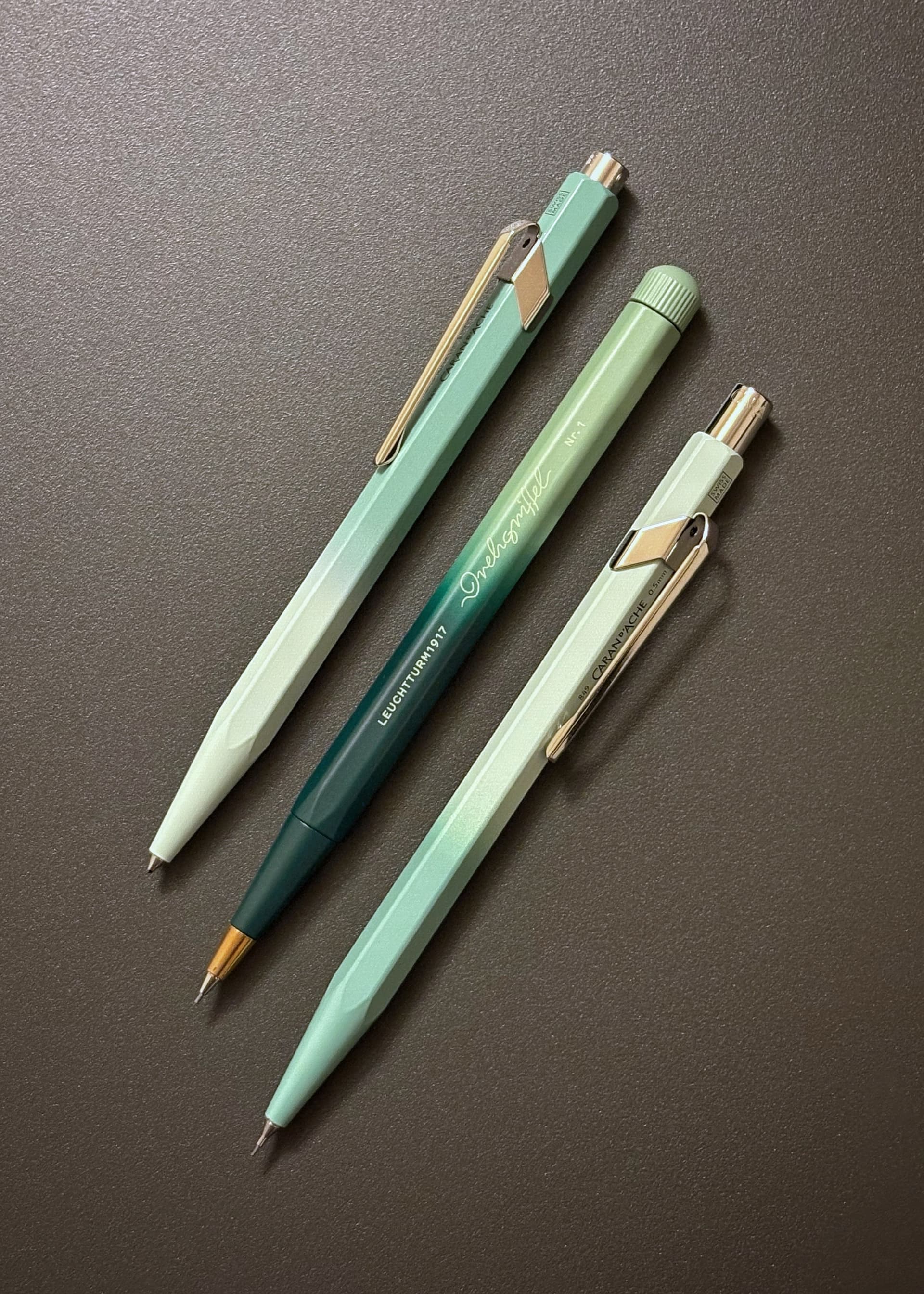• Leuchtturm Drehgriffel Nr.2 0.7mm twist pencil in hand-finished ‘Forest Green / Sage’ gradient. Most of the shops in Singapore were selling the ballpoint and I was lucky to find one branch of NBC Stationery (under Kinokuniya) that stocked the pencil.