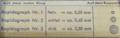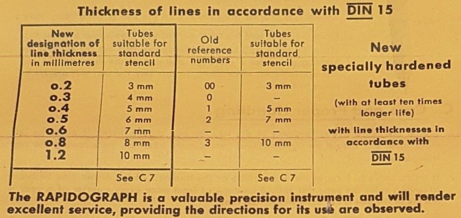 It also explains why 0.6 mm and 0.7 mm pens are labelled “2 1/2” in America. However, what is really strange is that the first generation rapidograph instructions give completely different thicknesses for numbers 1 and 2 (including the bizarre width 0.45 mm that, to the best of my knowledge, never appeared again, anywhere!):