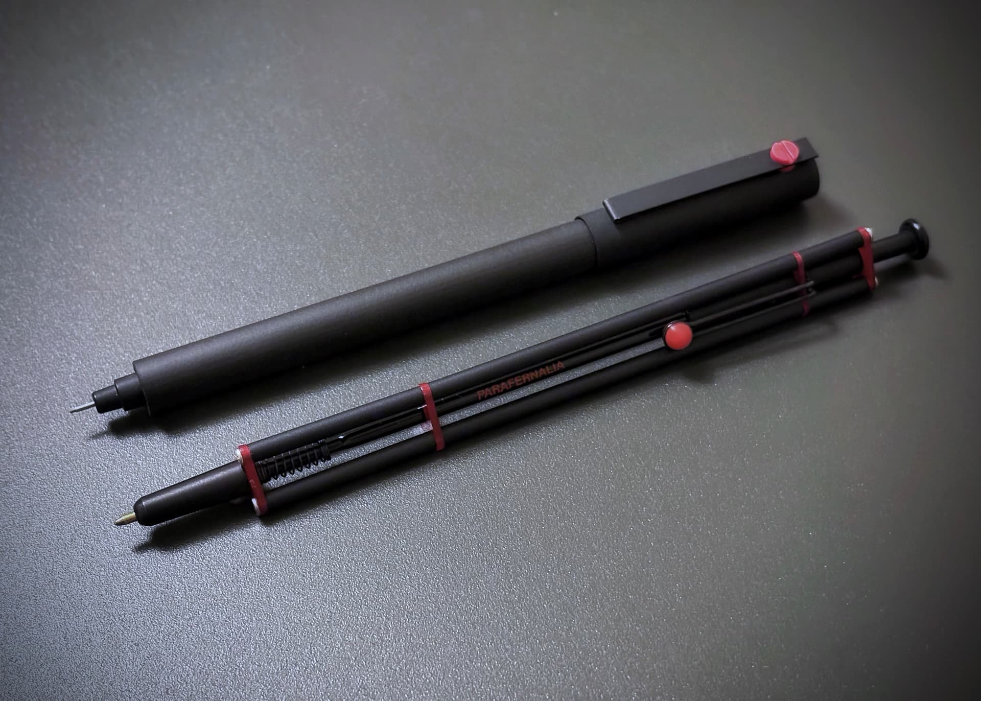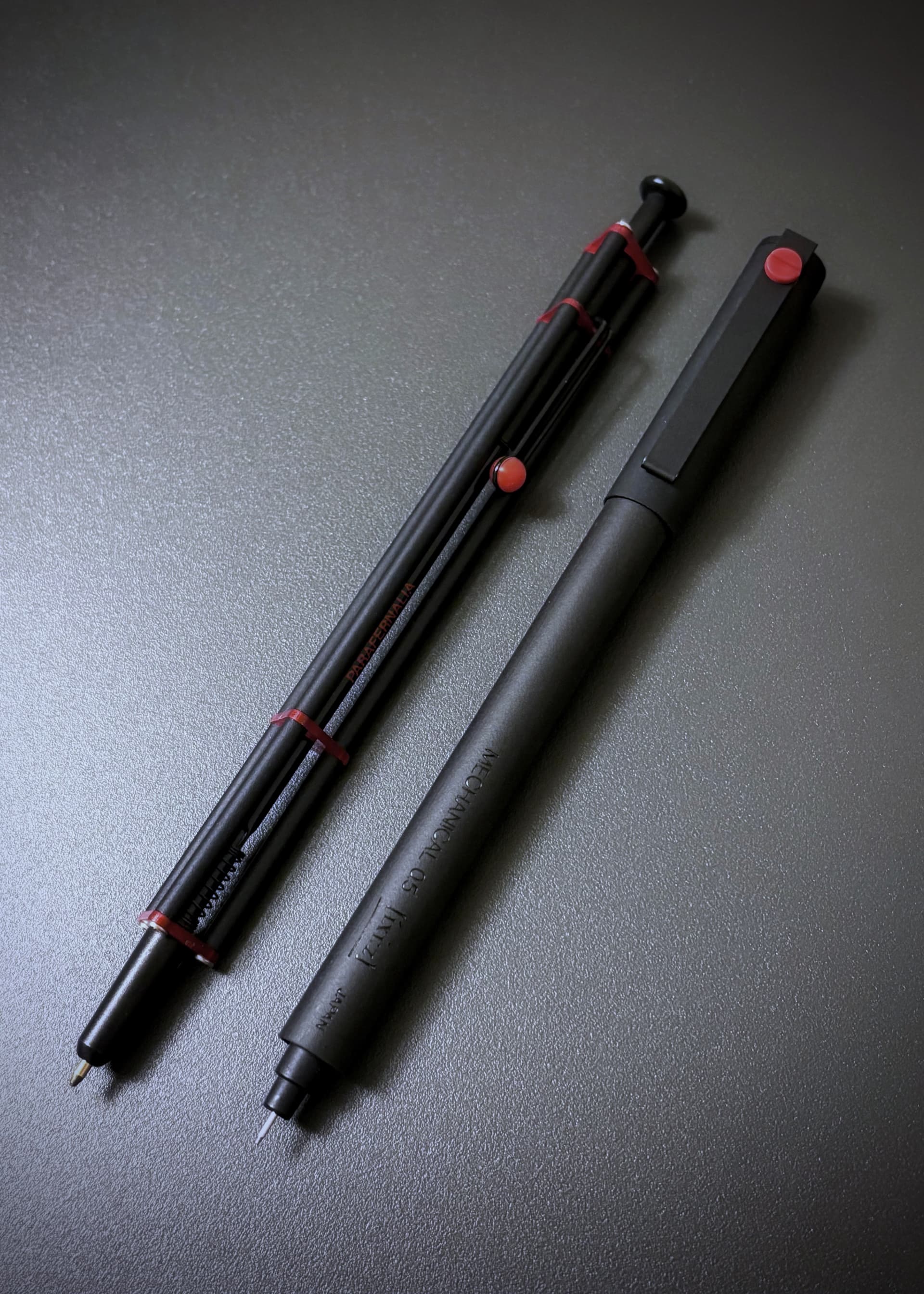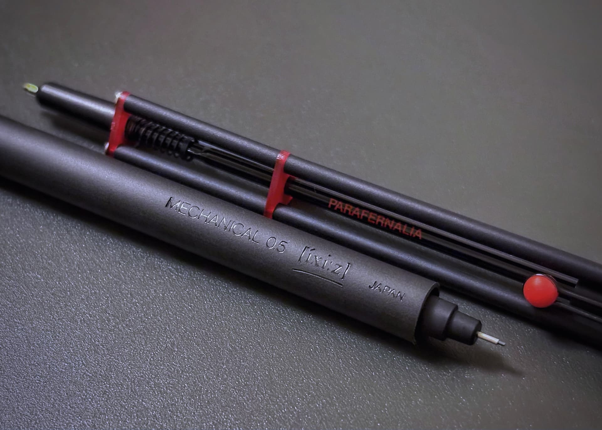 My little tribute to the unknowable relationship between Parafernalia and Platinum in the 1980s. The initial run of [ixi:z] fashion label stationery was mostly filled out by relabeled / licensed Parafernalia designs, but later, Platinum produced (or designed and had them made by Kotobuki?) several original non-Parafernalia models like this cap-knock pencil in black rubberized coating. I picked this lesser seen Revolution pen to pair with it as the matte black / red accents seemed like the perfect match.