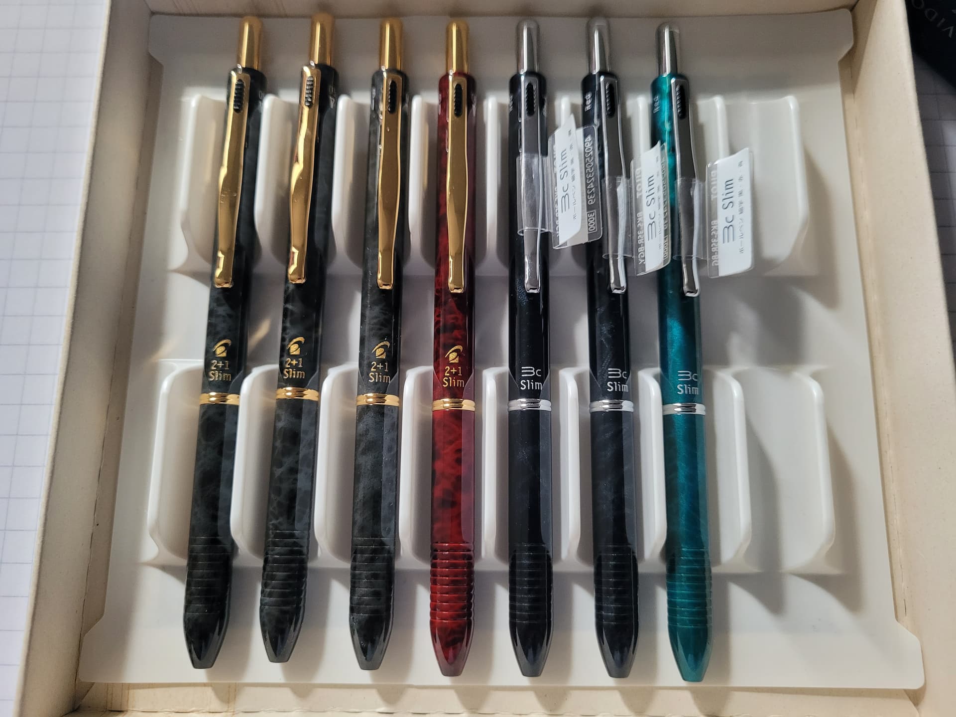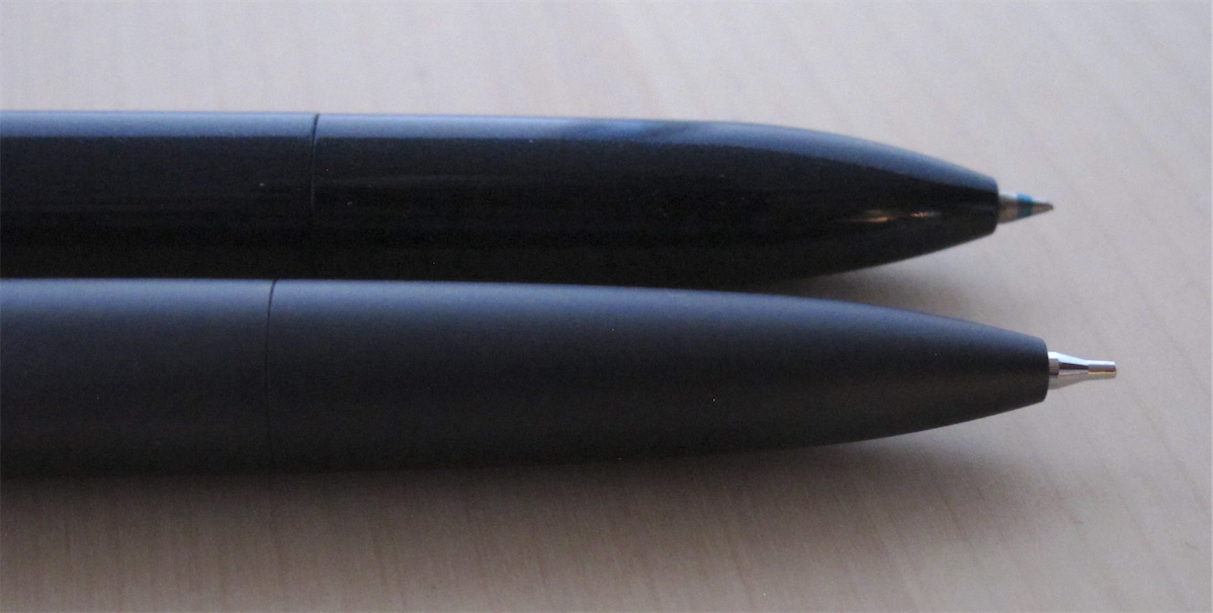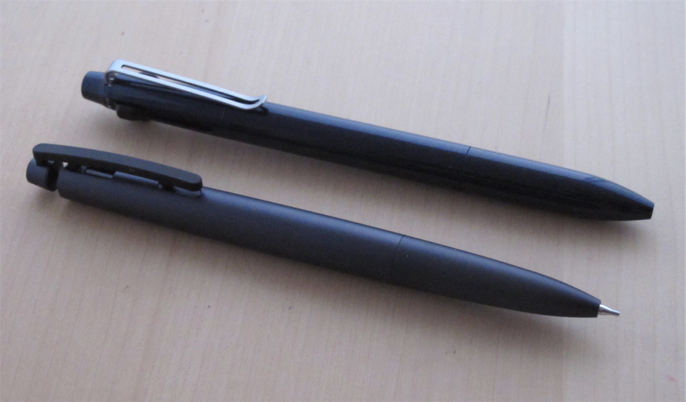 My little tribute to the unknowable relationship between Parafernalia and Platinum in the 1980s. The initial run of [ixi:z] fashion label stationery was mostly filled out by relabeled / licensed Parafernalia designs, but later, Platinum produced (or designed and had them made by Kotobuki?) several original non-Parafernalia models like this cap-knock pencil in black rubberized coating. I picked this lesser seen Revolution pen to pair with it as the matte black / red accents seemed like the perfect match.