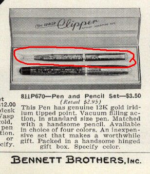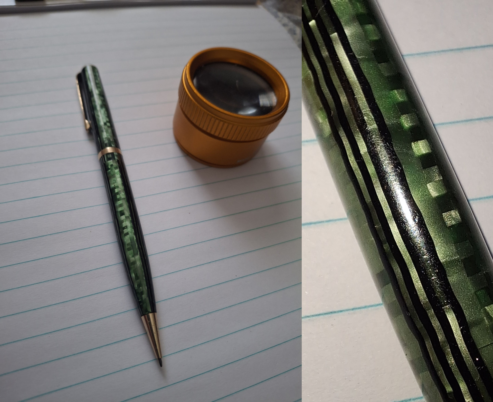 “The Clipper” by the WASP Pen Co. Inc., Fort Madison, Iowa, USA, circa 1941, features the brand’s distinctive “circuit board” celluloid and a second-generation domed end piece. It takes 0.036-inch (~0.9 mm) lead.
