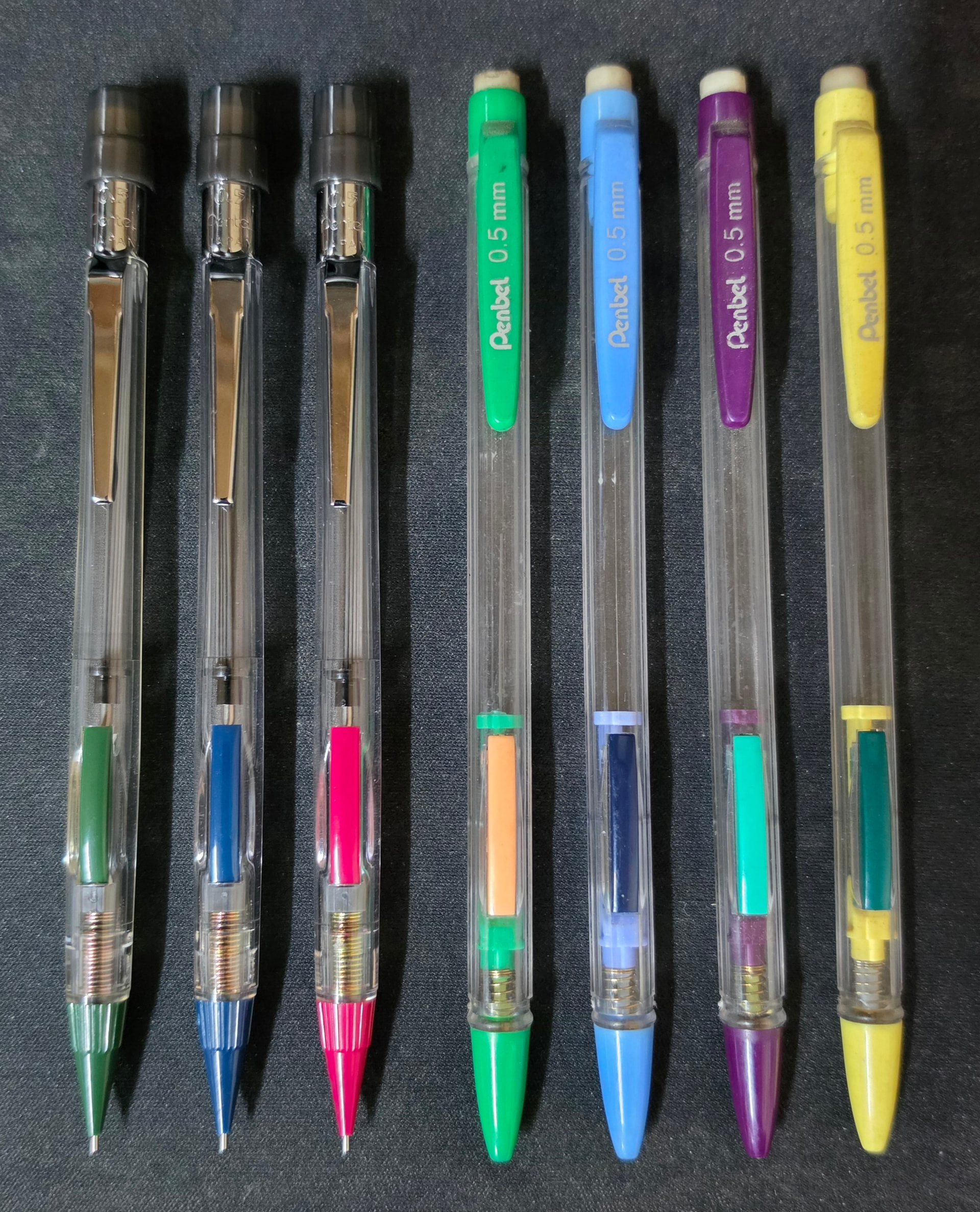 Ditto that. Would love to see a picture of the front of them. They appear to be mechanical pencils with sliding sleeves rather than double knocks.