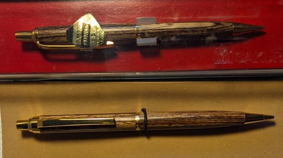 Sakura Create Sharp wooden series. I canât remember what kind of wood they use. Someone here might know. Theyâre very well made. Pipe slide. As you can see, the design varied a bit. The clip and rear metal furniture arenât the same. Also, one has a slight bevel to the center ring while the other is straight. The beveled one comes in the original box with „2000 price hang tag.