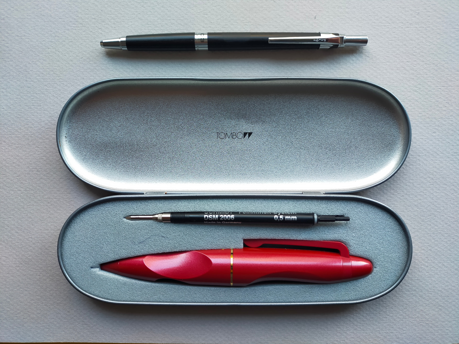 Mano box has a scratch on top and a few dings, the foam inside has a few ballpoint traces. The pen itself has a wierd mold mark under the simbol on top. No cracks or scratches. No eraser. Comes with the original black Tombow F refill working and a DSM Schmidt MP insert in 0,5.