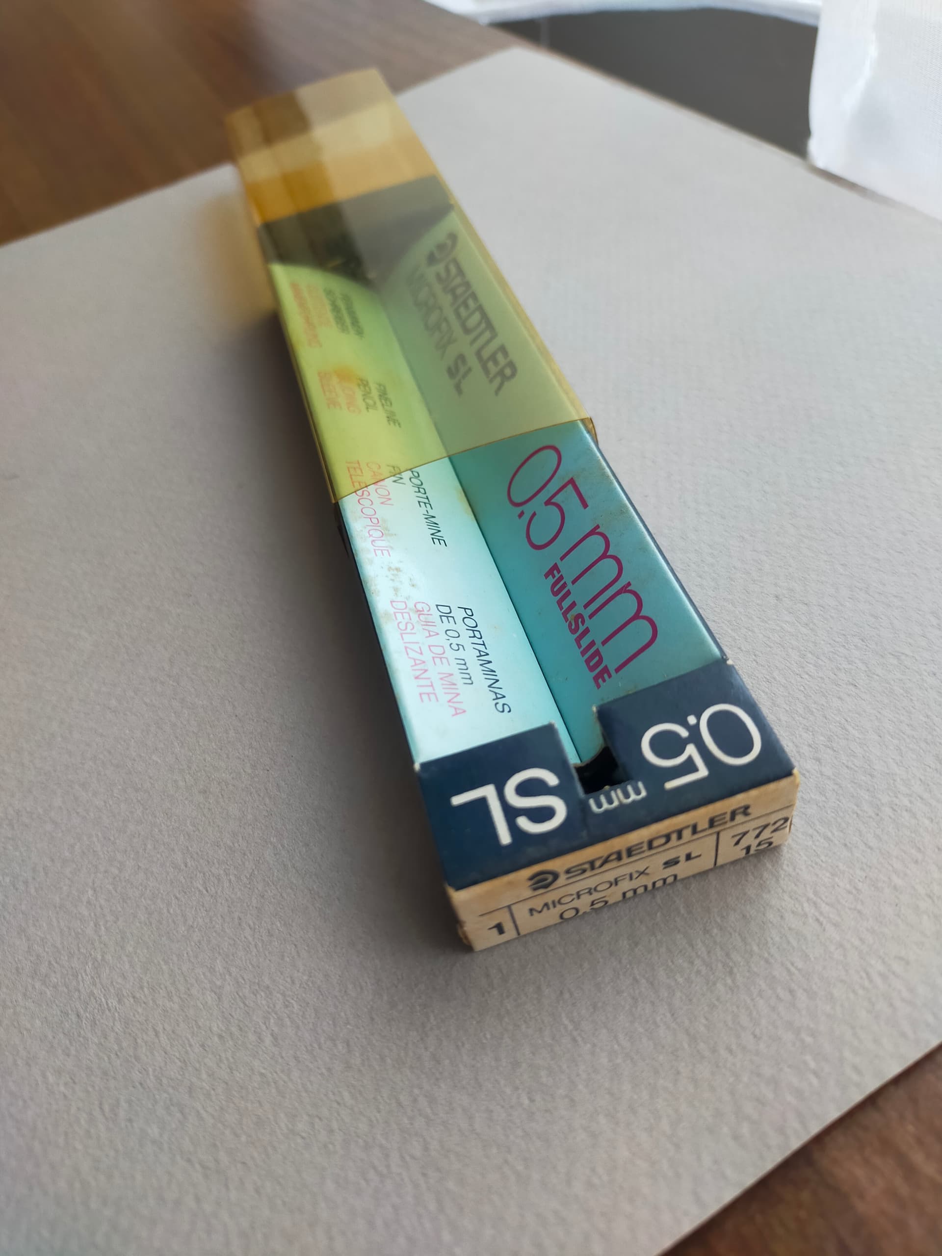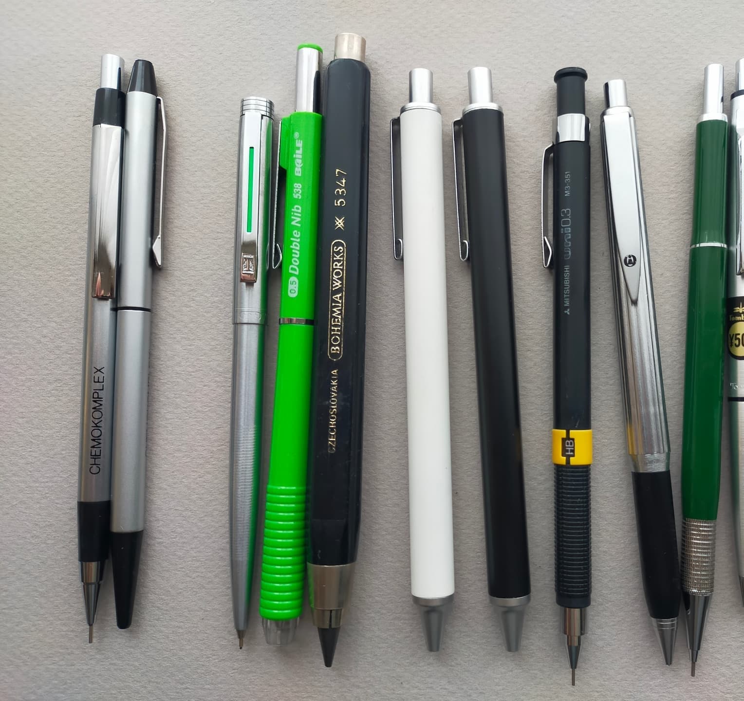Pentel XS all 3 colors, with sticker, new, unused, with box, unused green Pentel Crew, Staedtler Micro 770, Microfix S 773 both very little used, with a few scratches (drawer wear). Both have the two piece plastic clutch.